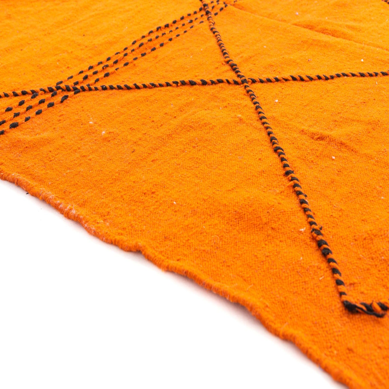 A bold geometric piece in a warm orange ground, this hand-knotted 100% wool rug is defined by a large diamond lattice worked in contrasting black yarn. The slim, twisted black lines create a subtle raised texture against the plush orange field, while short knotted fringe at the ends gives a finished, crafted touch. The hand-knotted construction produces a dense, springy feel underfoot with small variations in the weave that give the surface visual depth and tactile interest.