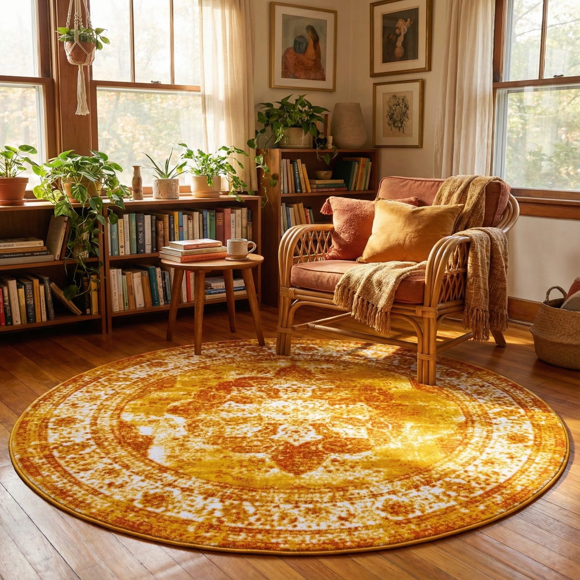 With its stain-resistant and shed-free properties, this rug is not only an attractive addition but also a practical choice for high-traffic areas. The rug's round shape makes it versatile, ideal for centering a seating area, or under a round dining table, adding balance and symmetry to the arrangement. The warm tones of the rug are well-suited for interiors with a Bohemian, eclectic, or even a minimalist style that would benefit from a pop of color. This rug can also serve as a focal point in a neutrally-toned space or complement an interior with autumnal color schemes.