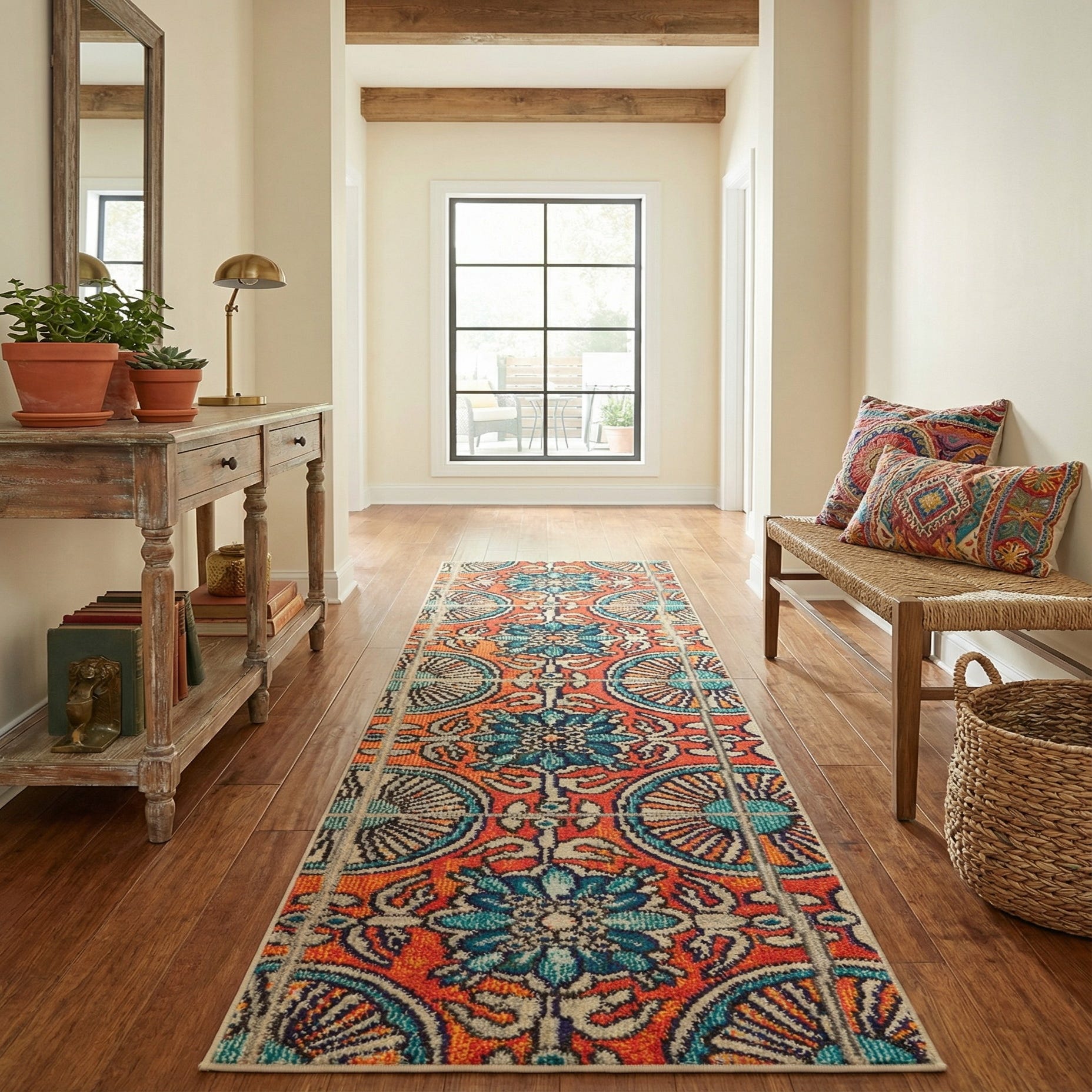 As a runner, this piece works well in a bright hallway or entry, where the orange field brings warmth and the blue-green medallions guide the eye down the space. It pairs naturally with warm wood tones and brass hardware for a mid-century modern look, or with layered textiles, woven baskets, and eclectic artwork for a bohemian vibe. Use it alongside a neutral kitchen island to introduce color, or place it in a narrow corridor to create a bold, decorative path.