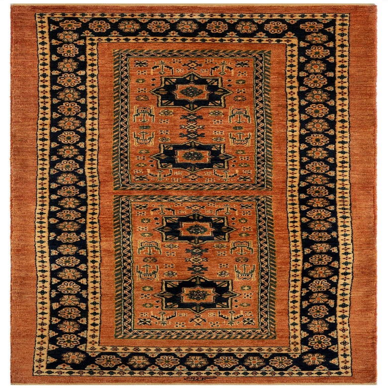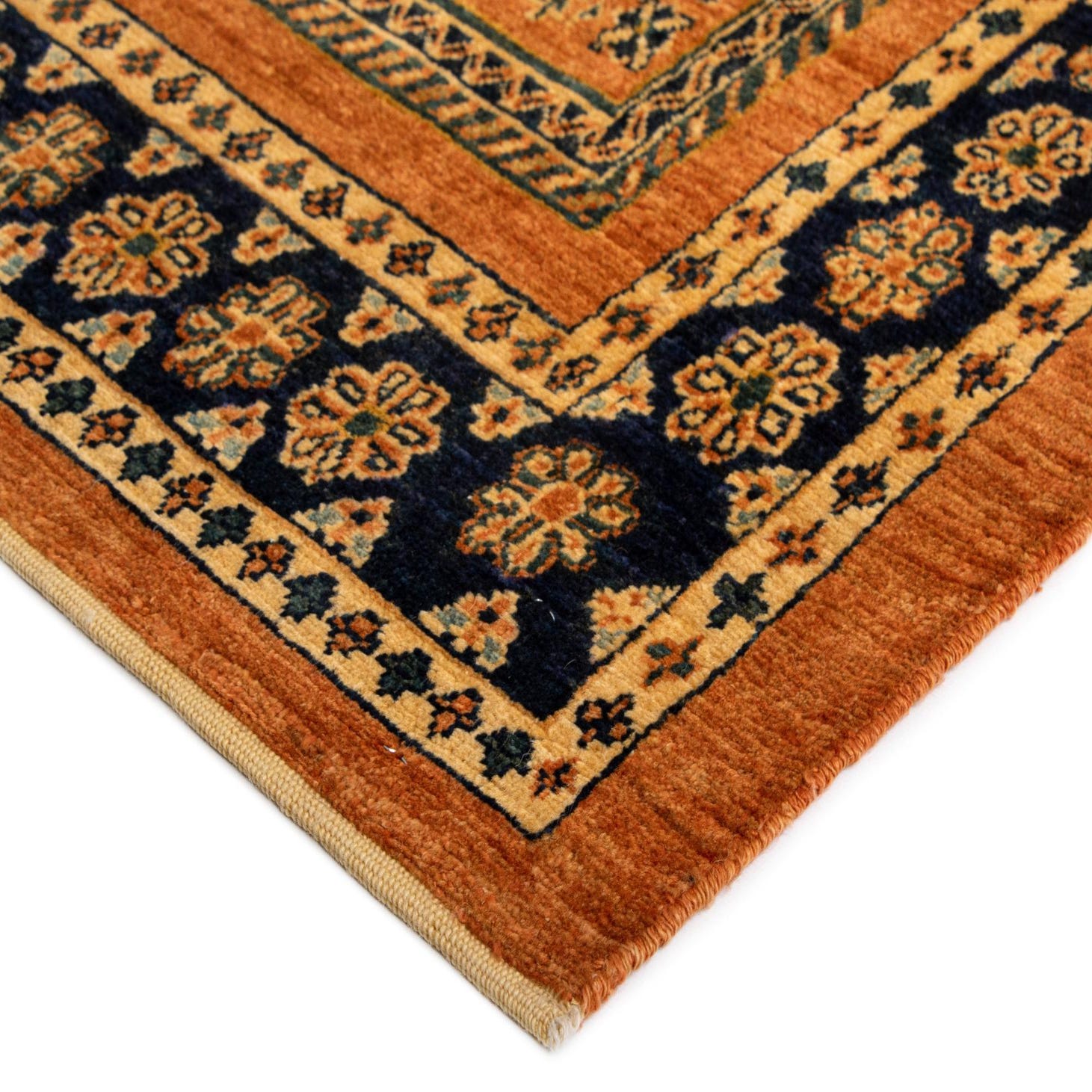 Primary color is Orange. Colors in this rug include: Orange, Orange, Dark Blue, Beige, Green.