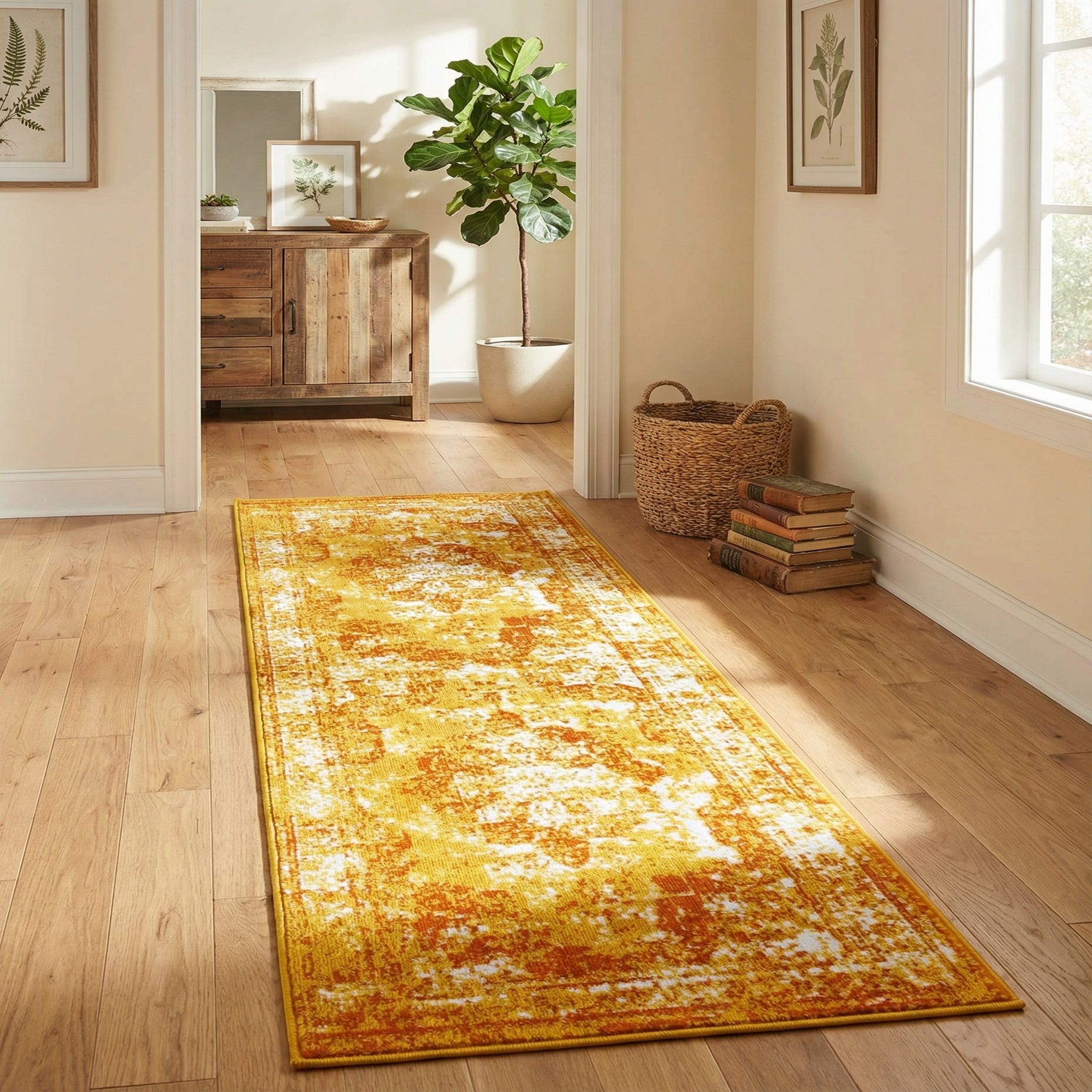 The Monte Carlo 7 Ft Runner rug presents a vibrant addition to any hallway or narrow space, featuring a radiant combination of orange, gold, and ivory hues that create a warm and inviting atmosphere. The orange background is prominently displayed, setting a rich and cohesive foundation for the gold and ivory tones to interact over, resulting in an elegant, abstract pattern with a distinct, almost distressed texture.