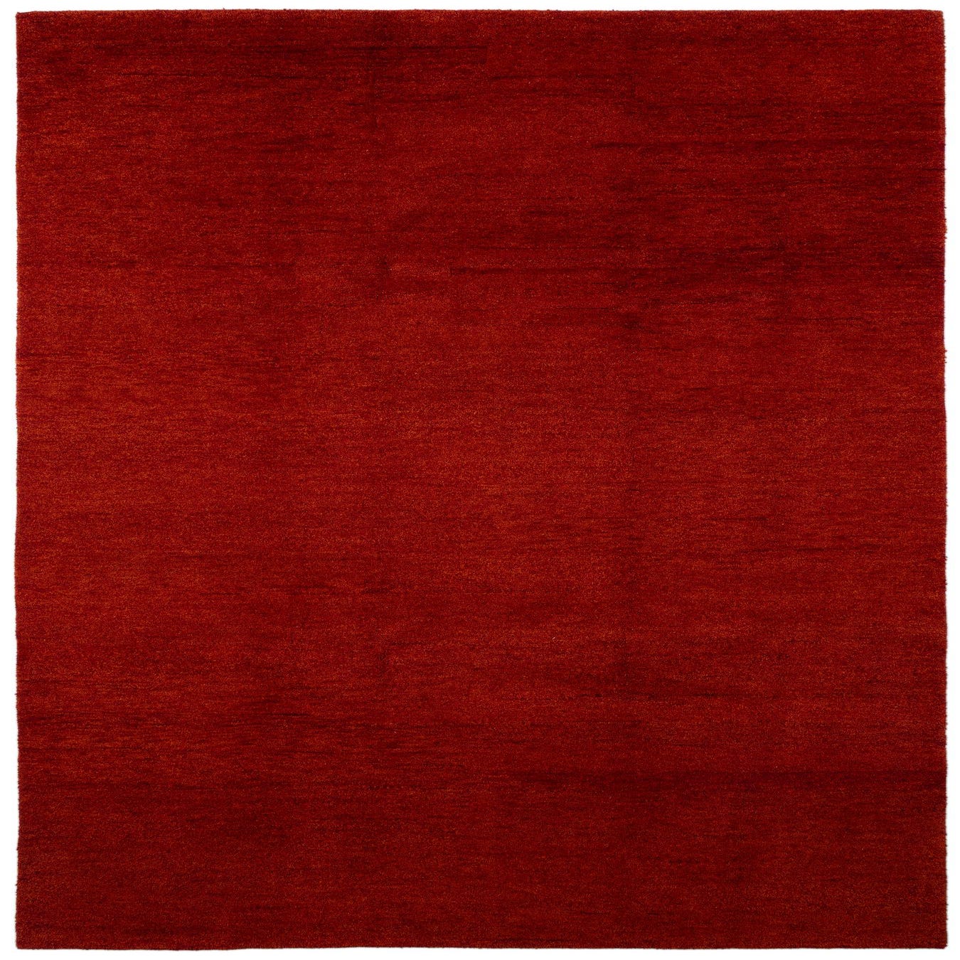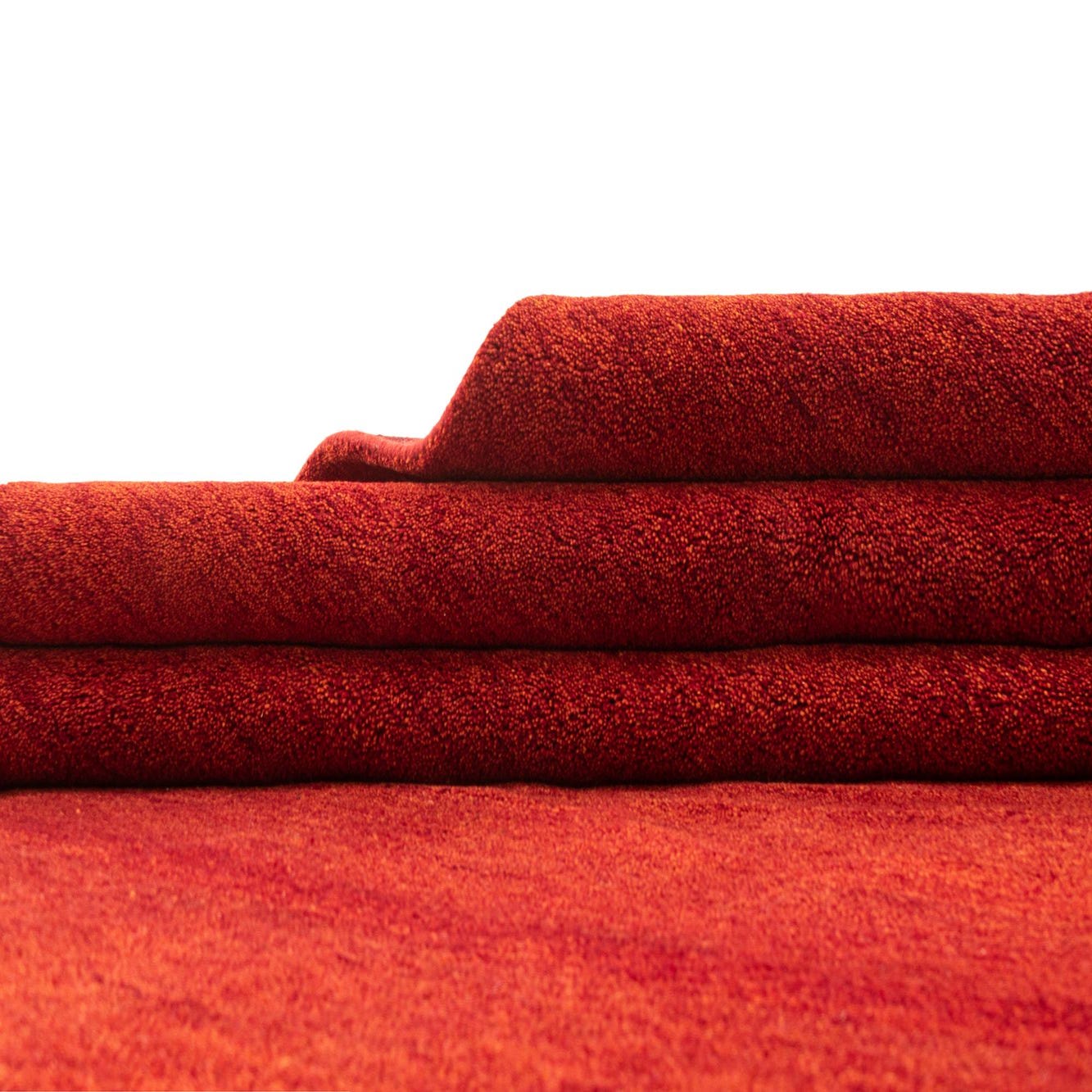 A 7x10 rectangular Indo Gabbeh rug in a rich, solid orange hue with a high pile, suitable for a living room.