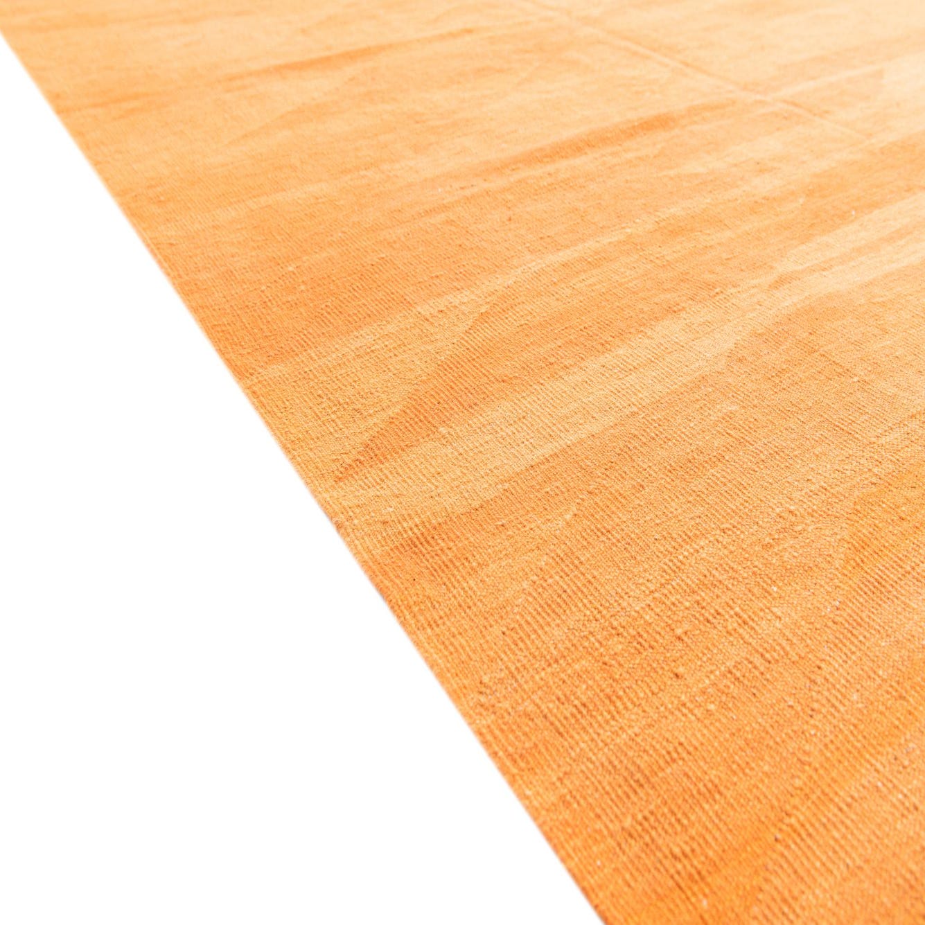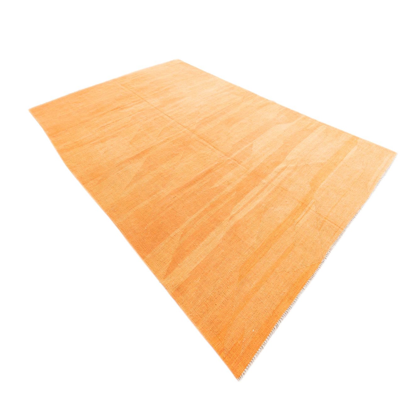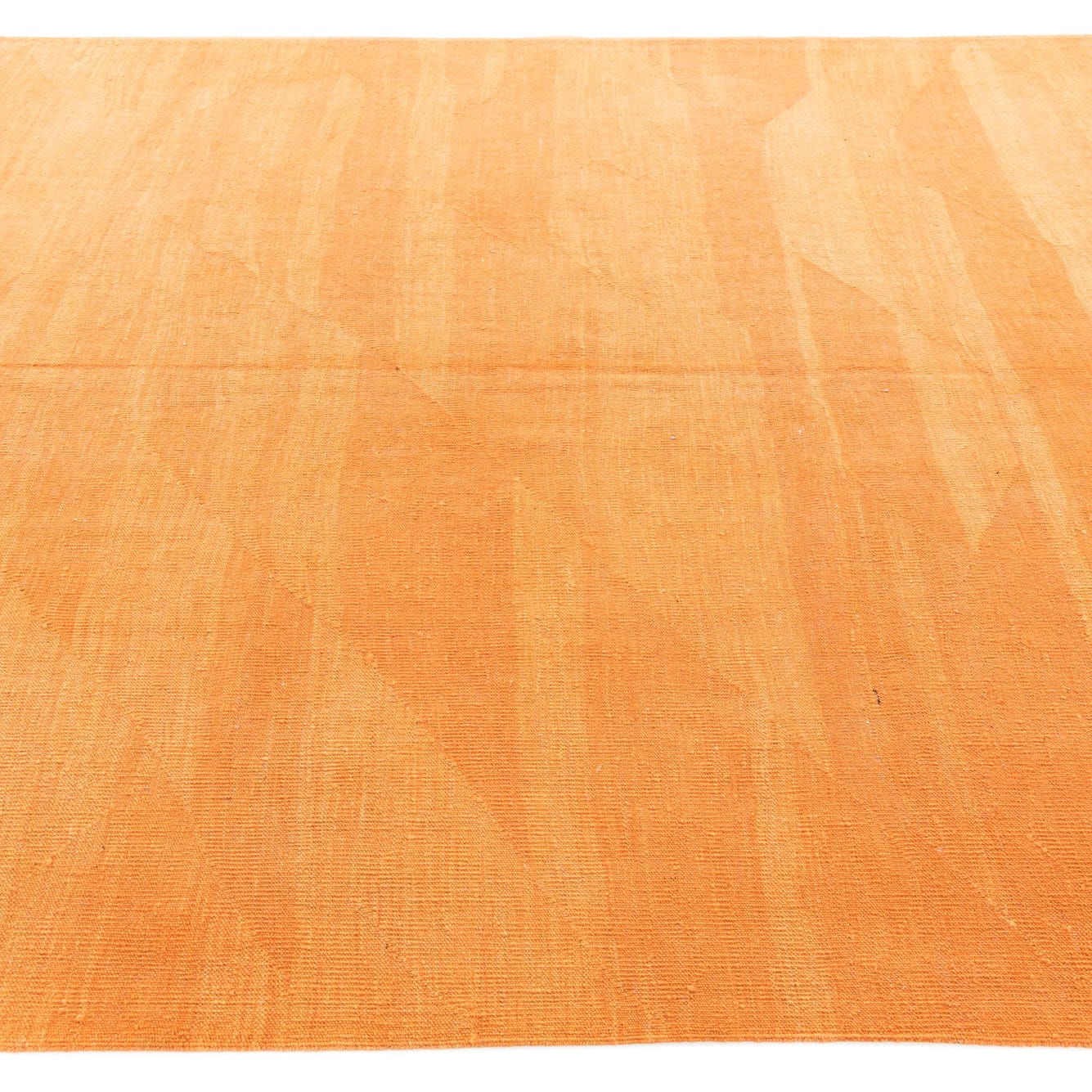 A 7x10 rectangular orange flatweave rug with subtle tribal patterns, suitable for a living room.