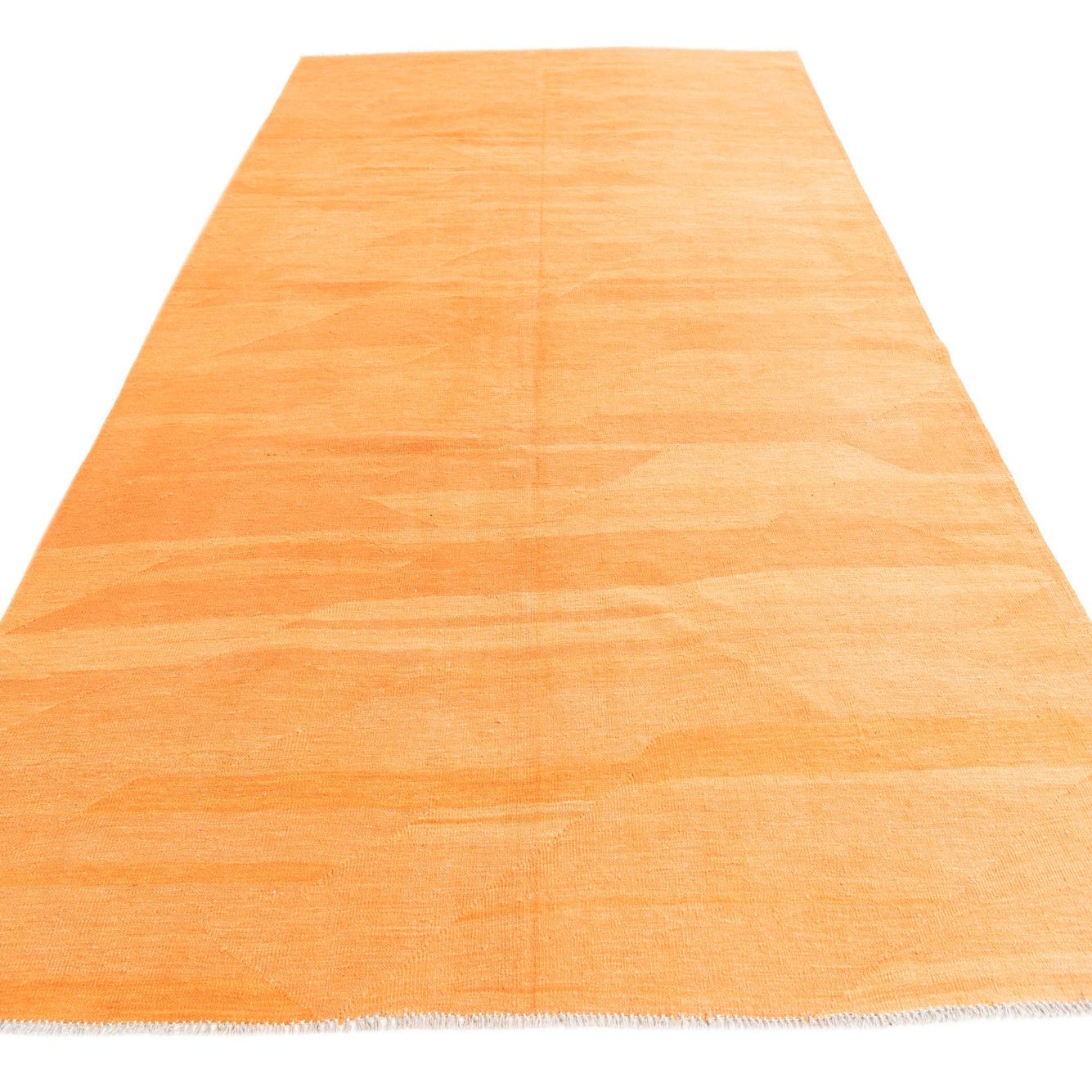 The rug's pattern is understated, incorporating minimalist lines that create a sense of movement and fluidity within its bold orange field. This design choice lends the piece a contemporary edge while maintaining the timeless appeal of traditional kilim rugs. The addition of fringe on either end adds a classic touch, providing a finished look that complements the rug's clean lines.