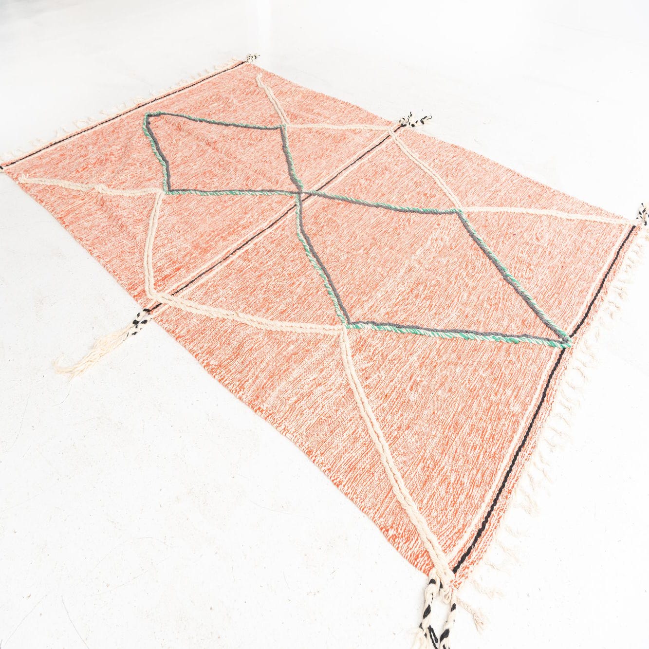 The rug's fringe adds an authentic touch to its edges, complementing the overall artisanal aesthetic. Ideal for a range of interior design scenarios, this rug would make a statement in bohemian, eclectic, or modern rustic settings, serving as a focal point in a living room, study, or spacious bedroom. The warm tones would pair well with natural wood finishes, leather accents, and a mix of textures, adding both visual interest and tactile appeal to an interior space.