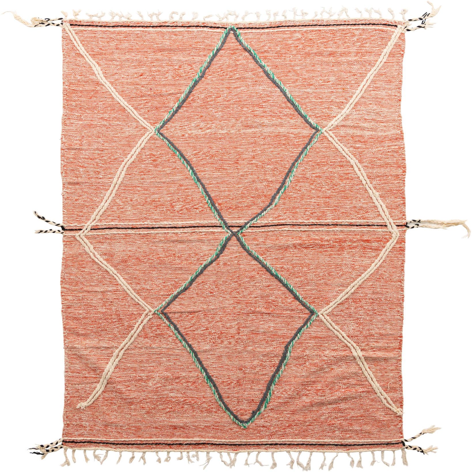 This 7x10 Moroccan collection rug is hand-knotted of 100% wool, showcasing durability and a plush texture that promises comfort underfoot. The pattern features a minimalist diamond lattice design rendered in a palette of orange, gray, green, ivory, and black, set against a warm orange background that brings a cozy vibrancy to any room. With a semi-antique age of 40-60 years, this rug boasts an enduring charm and a patina that narrates a story of traditional craftsmanship.