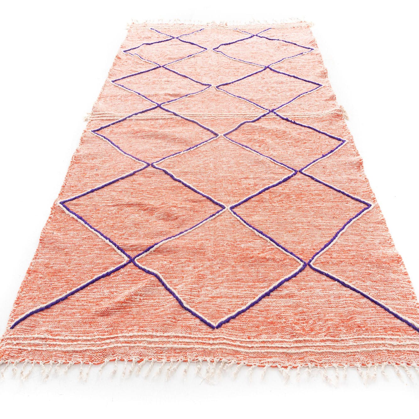 This Moroccan Collection rug would suit a variety of interior design scenarios, particularly those aiming to cultivate a warm and inviting ambience. It can serve as a statement piece in a minimalist setting or complement a more eclectic decor with its vivid colors and striking pattern. It would also integrate well with mid-century modern furniture, adding a pop of color to a neutral palette or serving as a centerpiece in a bohemian-inspired room. The woolen fabric ensures durability, making this rug not only an aesthetically pleasing choice but a practical one for both living areas and spaces that see high foot traffic.