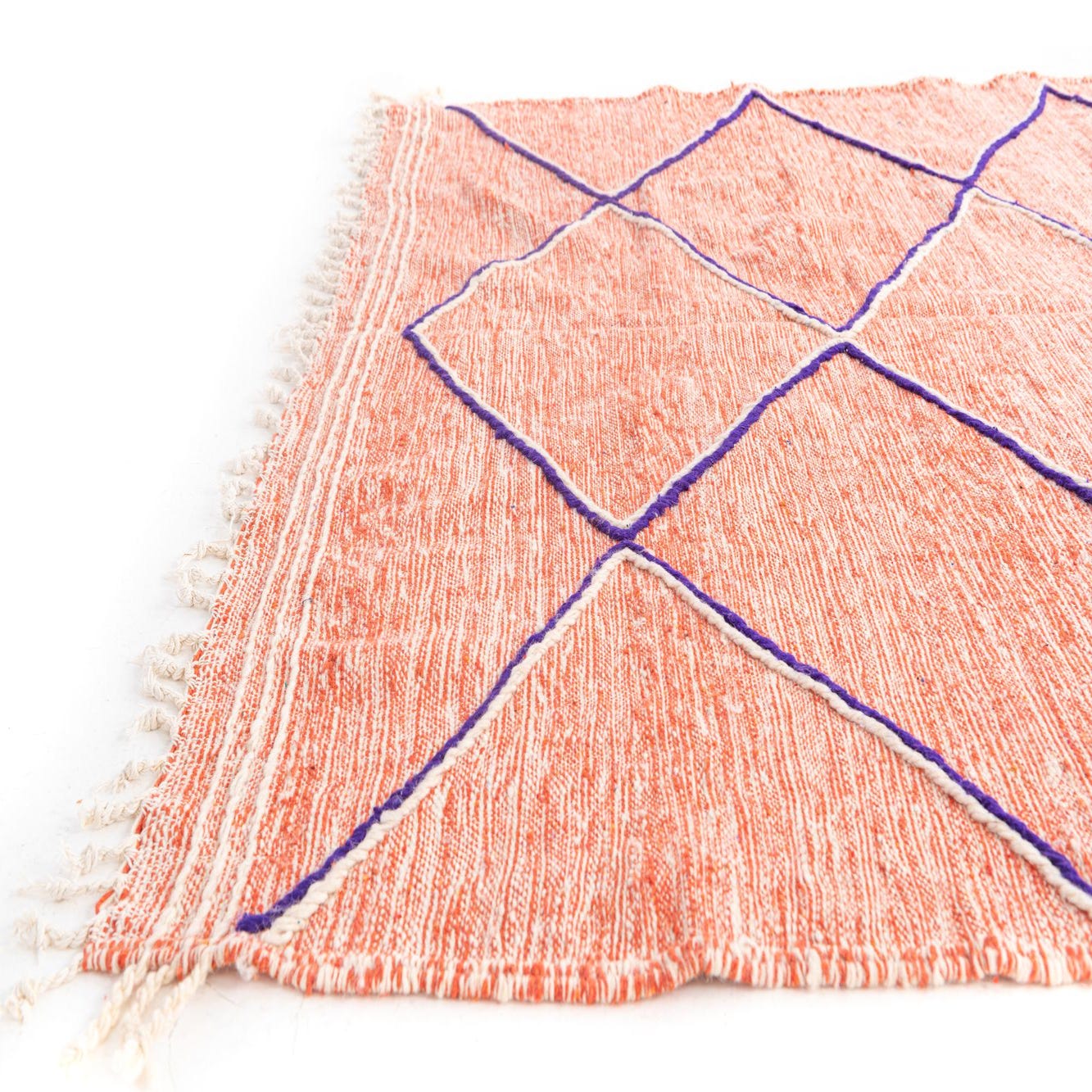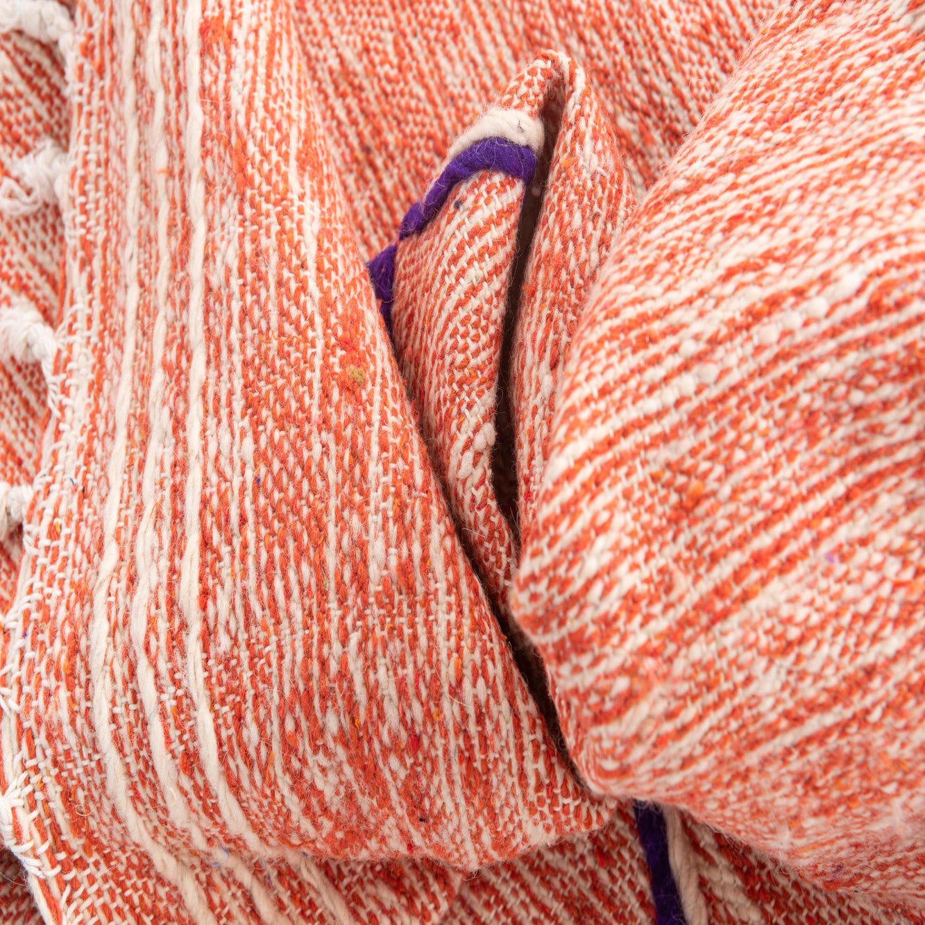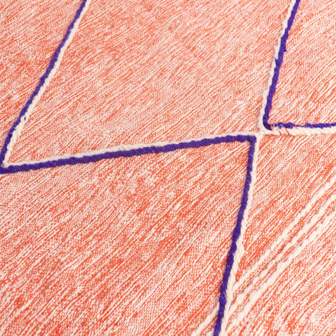 The Moroccan Collection offers a hand-knotted 7x10 rug featuring a vibrant orange background, complemented by ivory and purple accents, creating a dynamic and appealing visual contrast. The composition boasts a series of bold geometric patterns, defined by clean lines that form a repetitive, diamond-like motif across its surface. This wool rug presents a texture that is characteristic of traditional Moroccan hand-knotted craftsmanship, providing a tactile experience that is both dense and inviting to the touch.