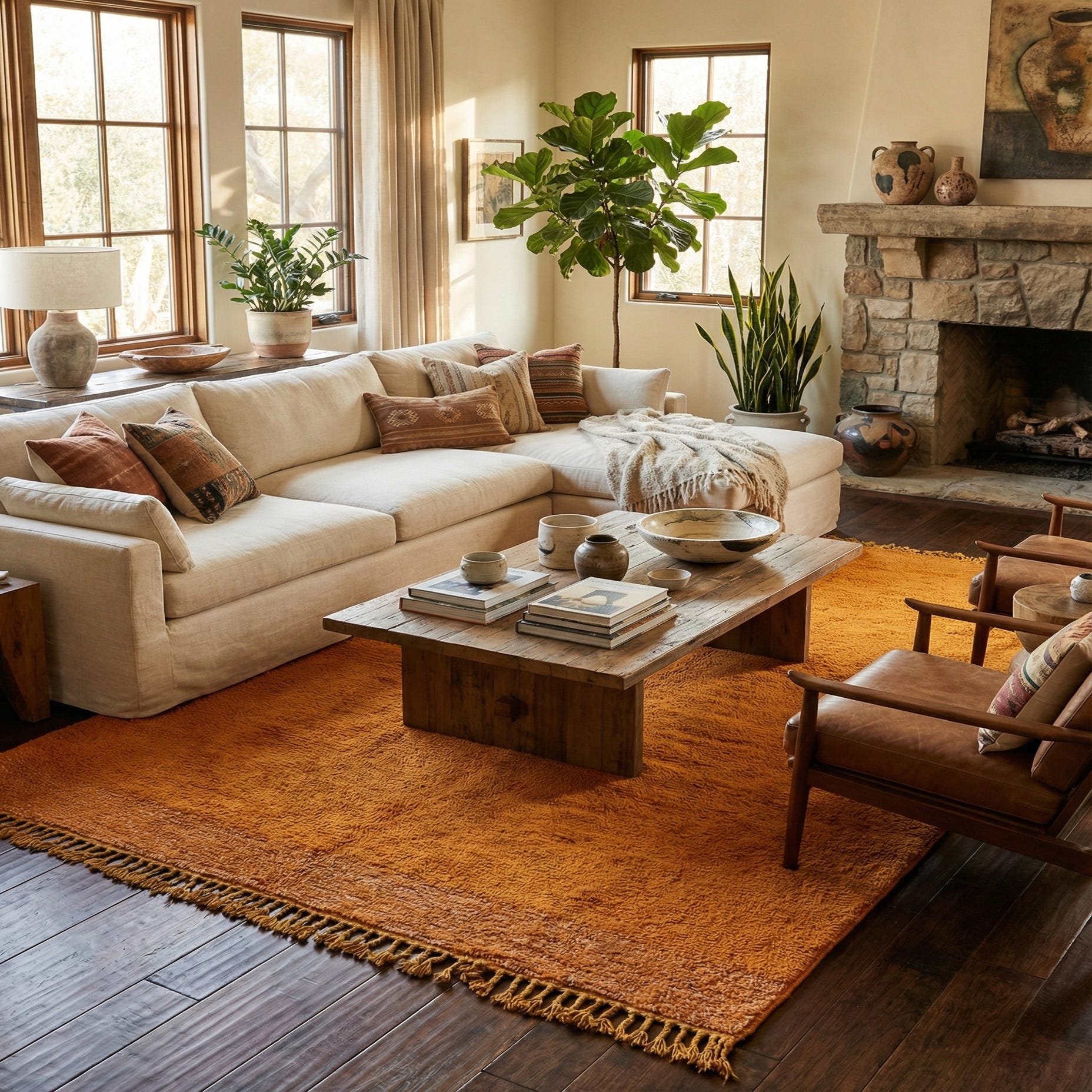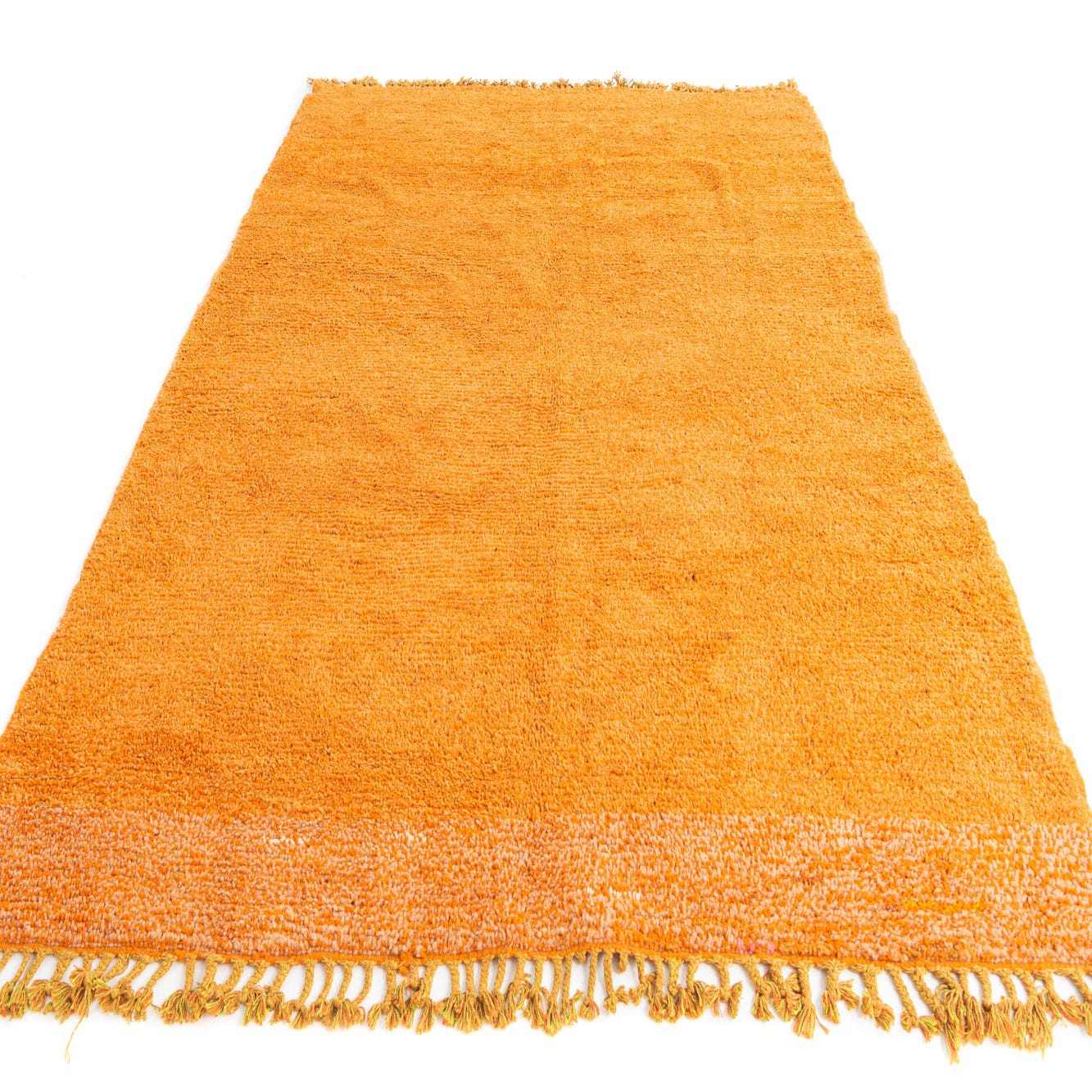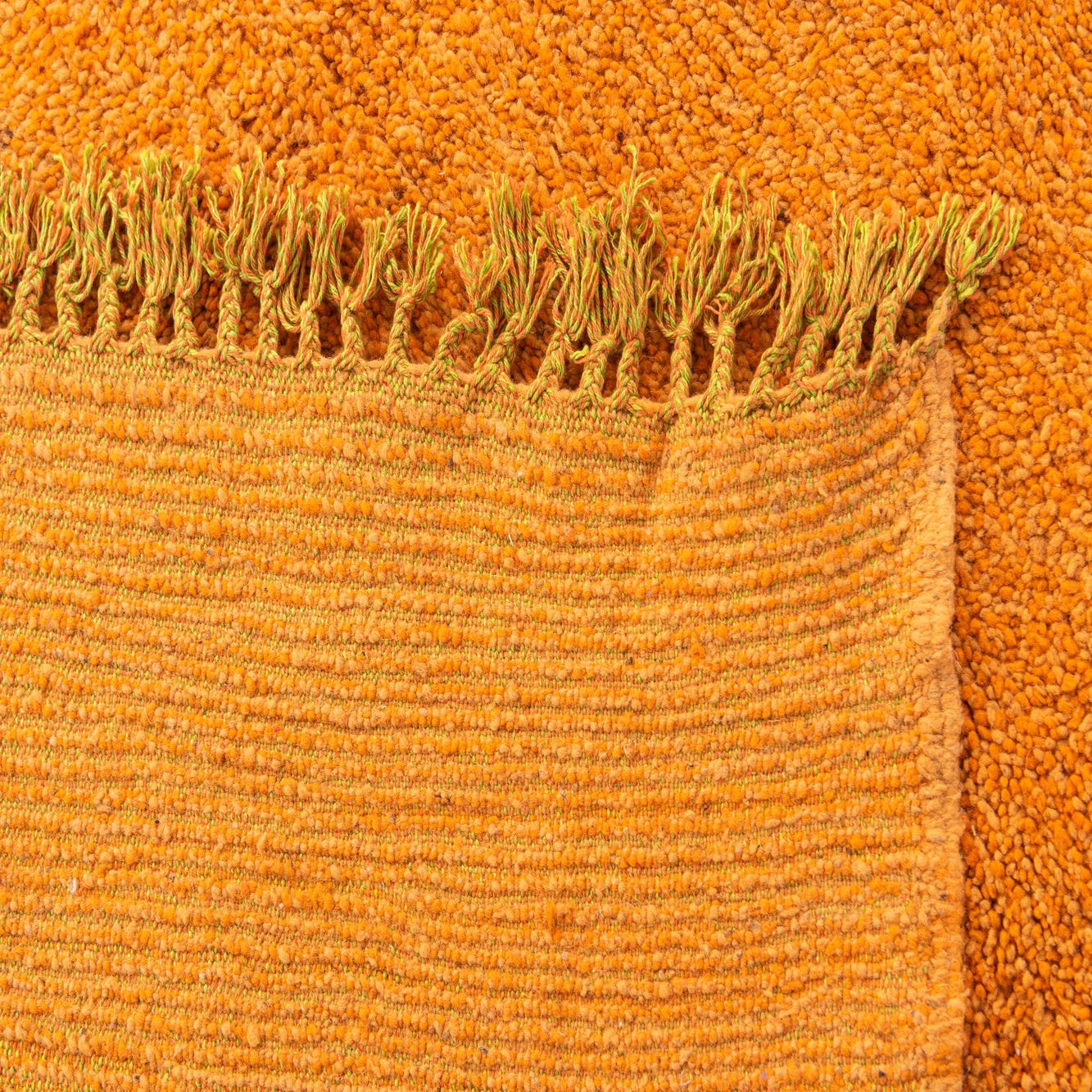 A 7x10 rectangular orange shag rug with a solid color and fringed edges, suitable for a living room.