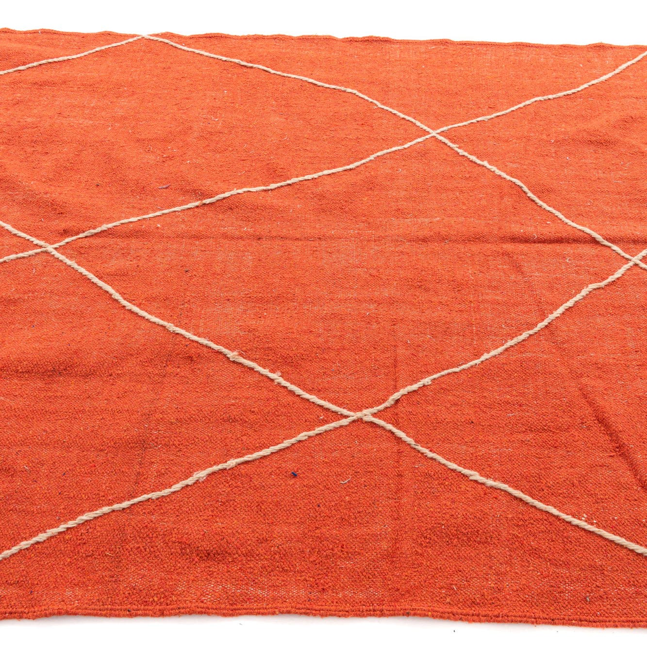The deep orange hue serves as an impactful anchor for a variety of interiors, providing warmth and depth to any space it inhabits. This rug complements mid-century modern furnishings, minimalist designs, or eclectic decor, where its vibrant color can stand as a focal point or harmonize with other bold accents. It is equally adept at adding a touch of time-honored charm to contemporary settings, bridging the gap between modern style and traditional craftsmanship.