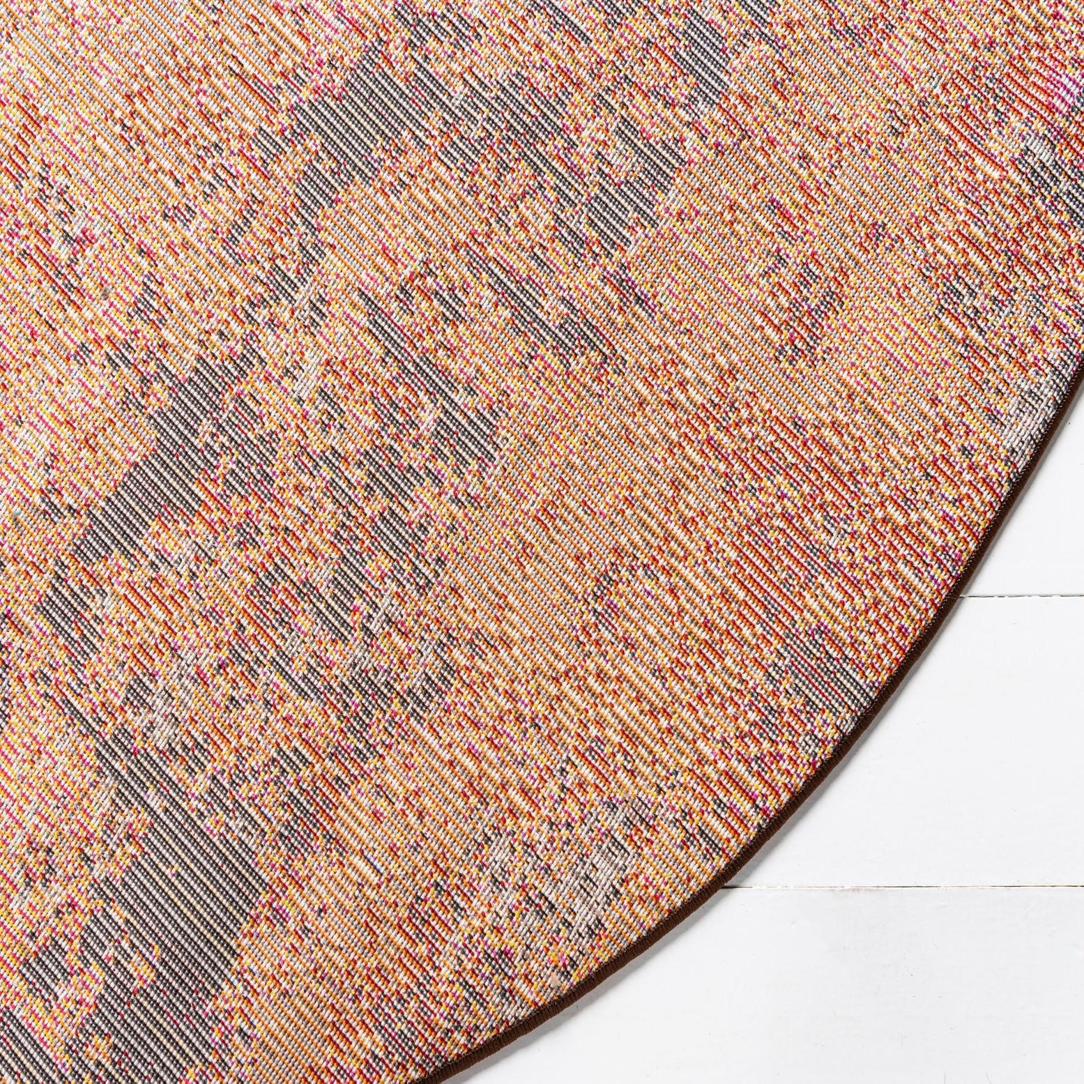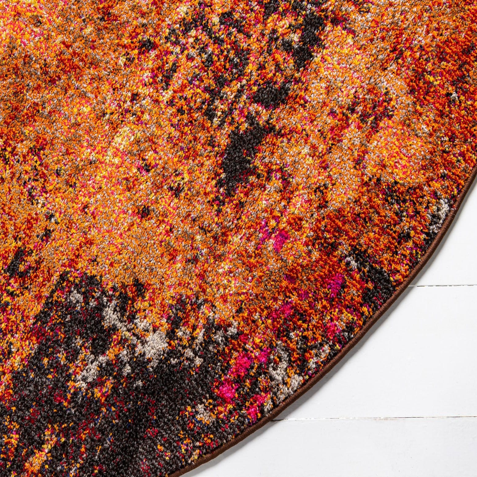 The Hyacinth collection rug is a vibrant addition to any space, with its machine-woven construction ensuring durability and ease of maintenance. The 100% polypropylene fibers provide a soft texture that is comfortable underfoot. This 8 Ft Round rug features a dynamic color palette including shades of orange, beige, brown, red, yellow, pink, peach, and puce, set against a predominantly orange background. The variegated pattern gives the illusion of texture and depth, making it a statement piece for a room.