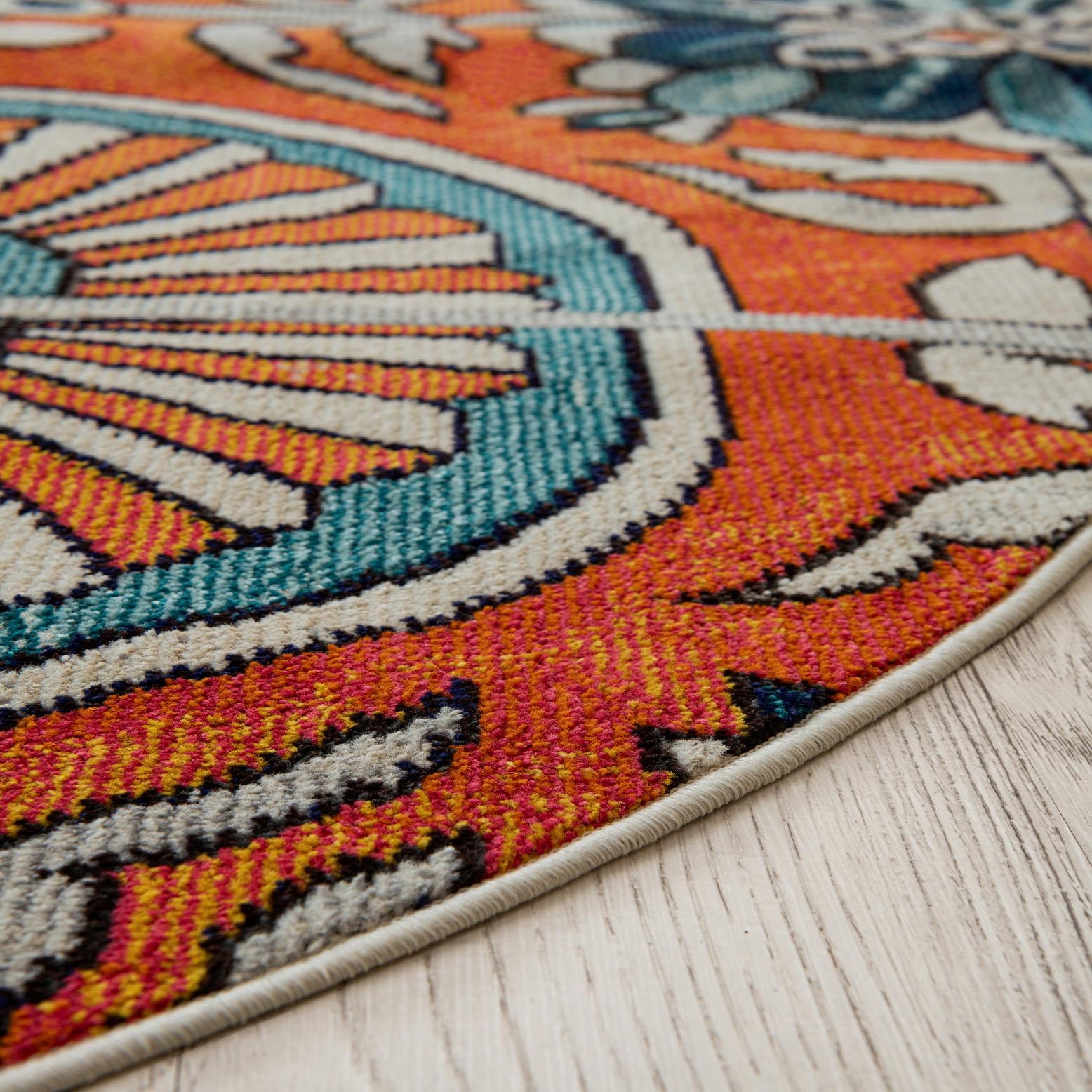 A lively tile-inspired pattern fills the round surface with alternating circular sunburst medallions and stylized floral rosettes set against a warm orange ground. Soft beige grid lines and vine-like accents create a structured layout while layered shades of blue, green, brown and beige build depth in each motif. Running your hand across the face reveals a low-profile, tightly woven texture that feels smooth and firm underfoot, with the printed colors holding clear definition across the design.
