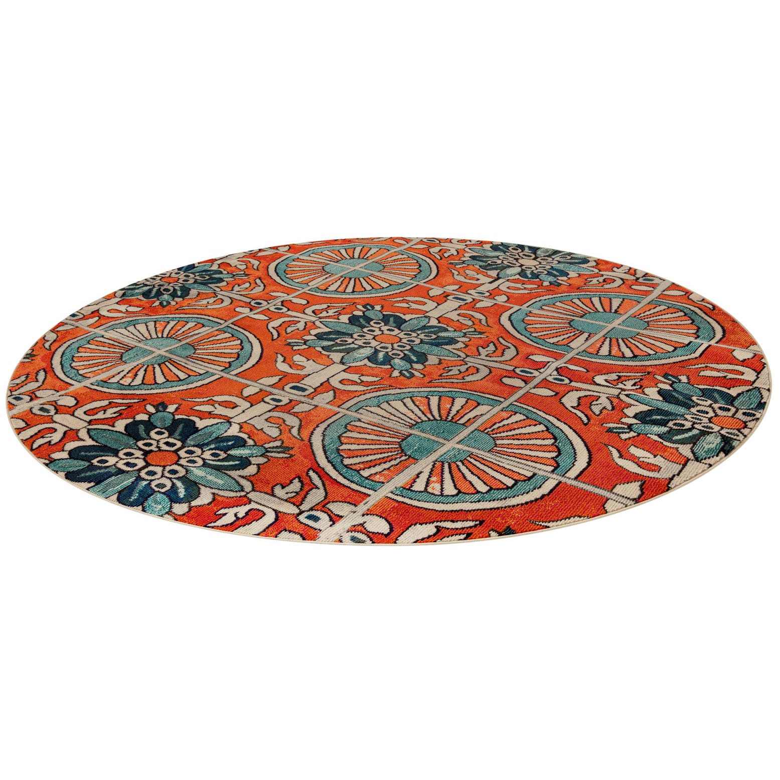 A lively tile-inspired pattern fills the round surface with alternating circular sunburst medallions and stylized floral rosettes set against a warm orange ground. Soft beige grid lines and vine-like accents create a structured layout while layered shades of blue, green, brown and beige build depth in each motif. Running your hand across the face reveals a low-profile, tightly woven texture that feels smooth and firm underfoot, with the printed colors holding clear definition across the design.