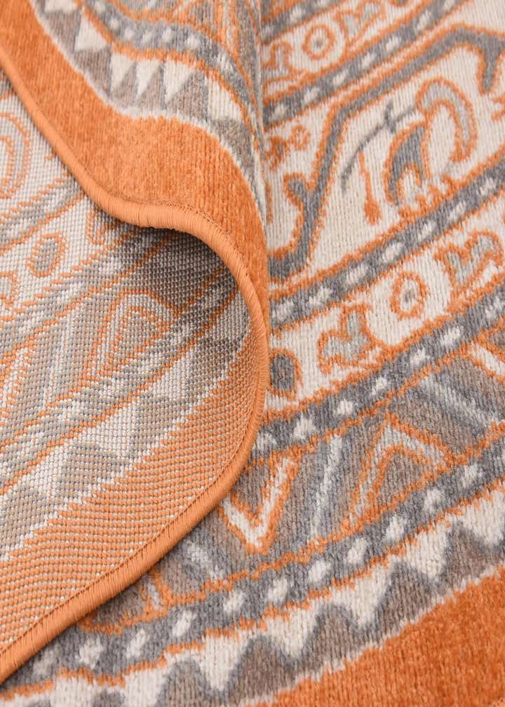 A round orange Southwestern rug with a detailed grey and cream traditional border, featuring a flat pile.