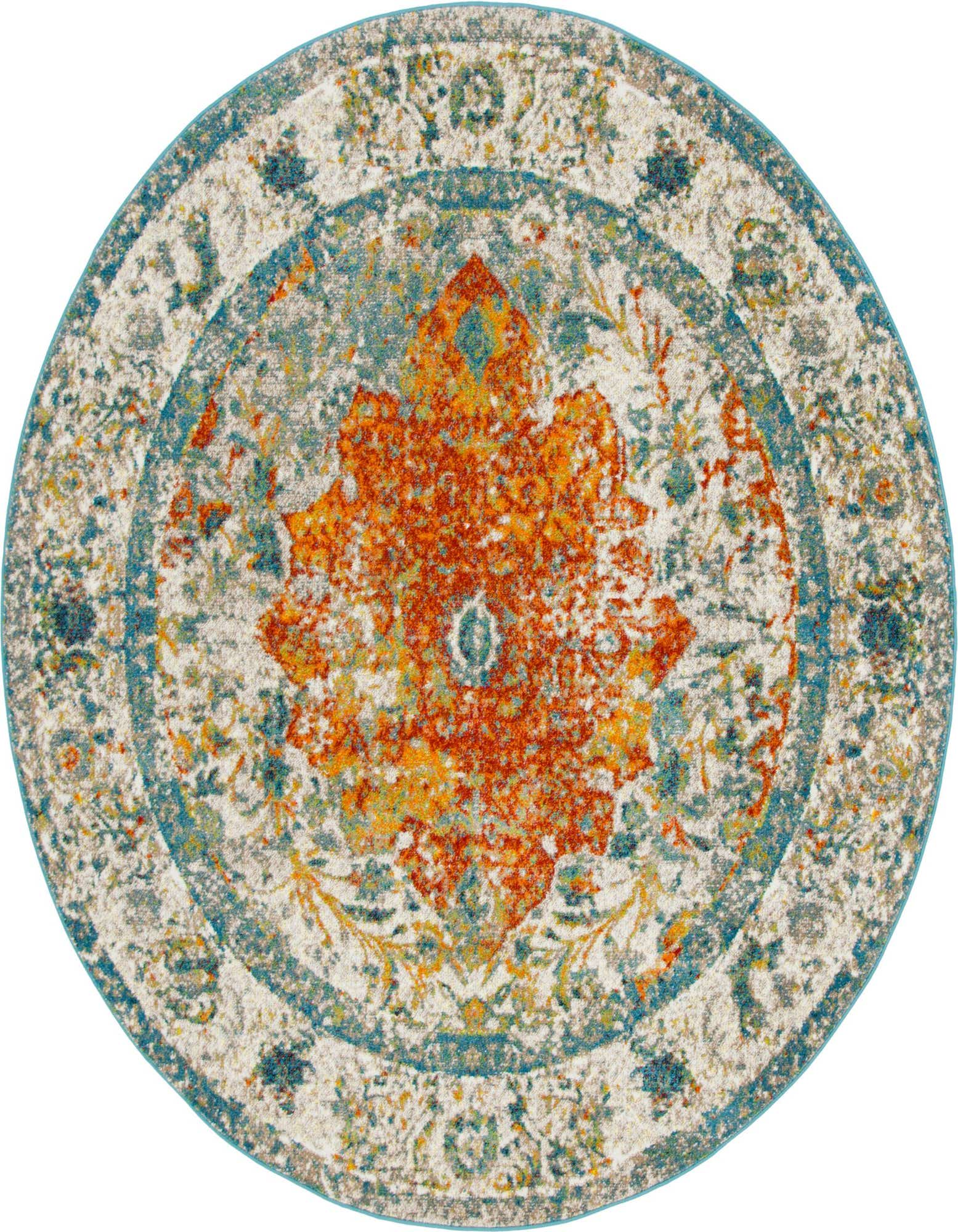 The Brighella collection presents an 8 Ft Round area rug, machine woven from 100% polypropylene, ensuring durability and easy maintenance. This rug features a dynamic pattern with a warm orange background, harmoniously blended with accents of beige, black, gold, ivory, red, and blue, creating a vibrant yet sophisticated look. The interplay of colors and ornate design elements form a visually appealing piece that adds a splash of color and ornamental charm to any space.