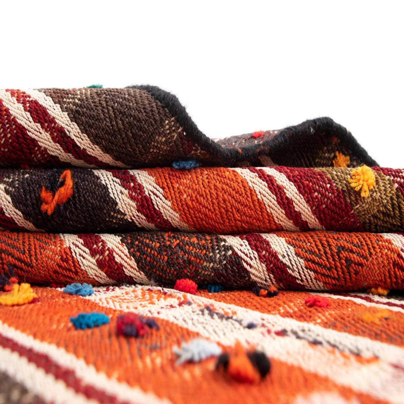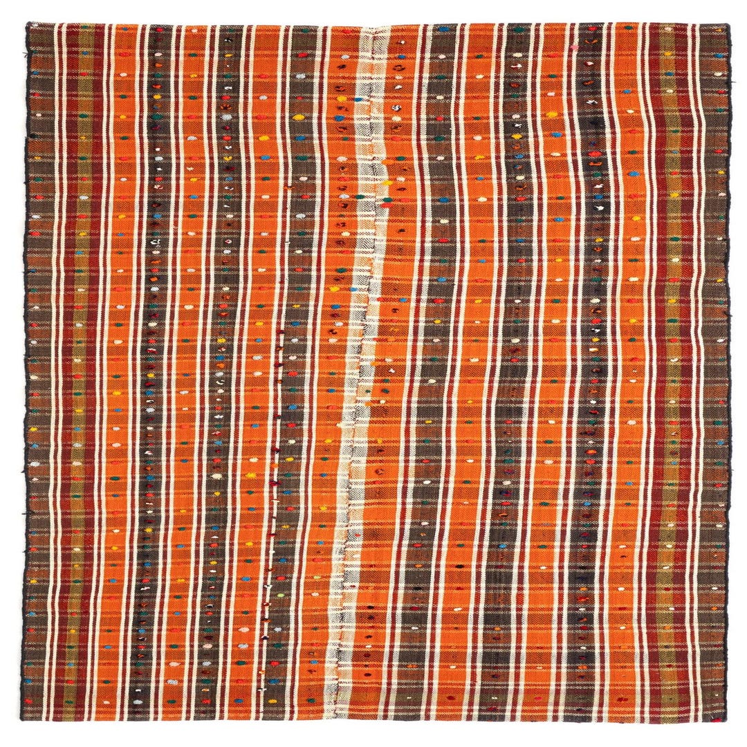 A vibrant 8 ft Jajim runner rug with vertical stripes in orange, brown, and red, accented with colorful dots.