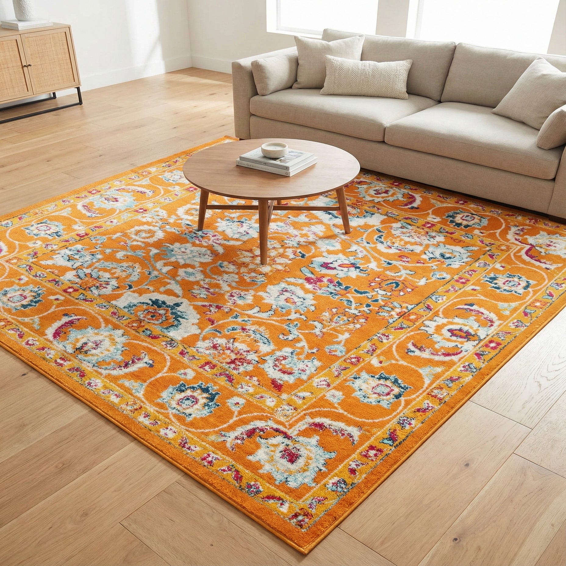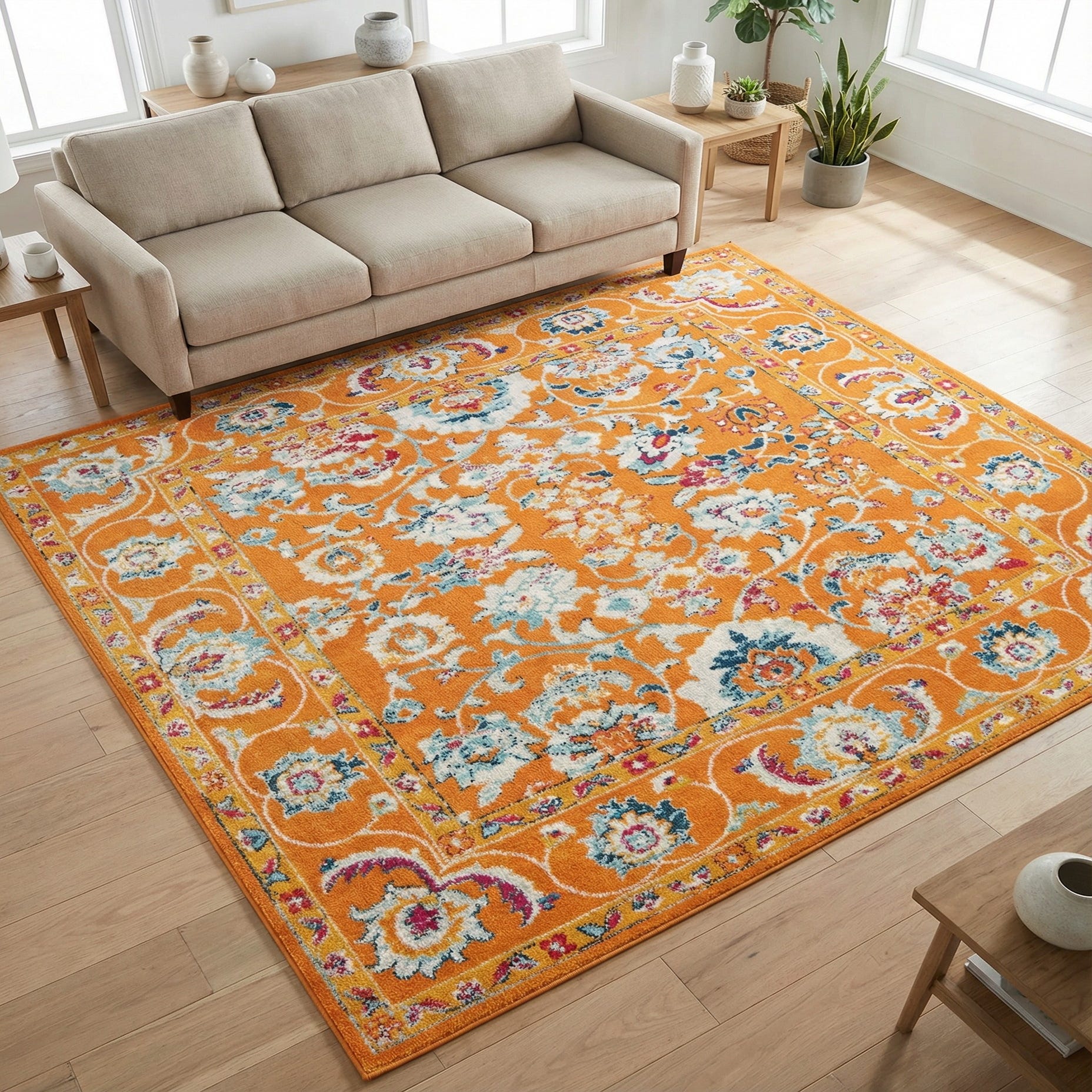 Machine-made from 100% polypropylene, this square rug pairs a lively traditional floral motif with a contemporary color story. The orange ground anchors a garden of stylized blossoms and scrolling vines rendered in ivory and light blue, with navy, red and gold accents adding contrast and depth. A defined ornamental border frames the central field, giving the pattern structure while the low-pile construction feels softly cushioned underfoot and maintains clear motif definition.