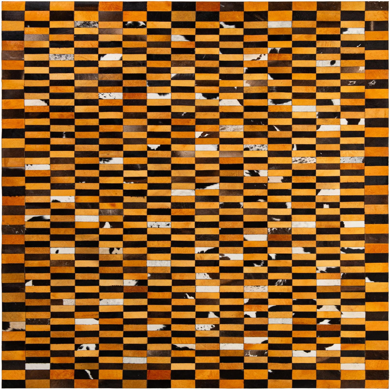 8x10 rectangular Cowhide Patchwork rug featuring a modern stripe pattern in varying shades of orange, black, and white.