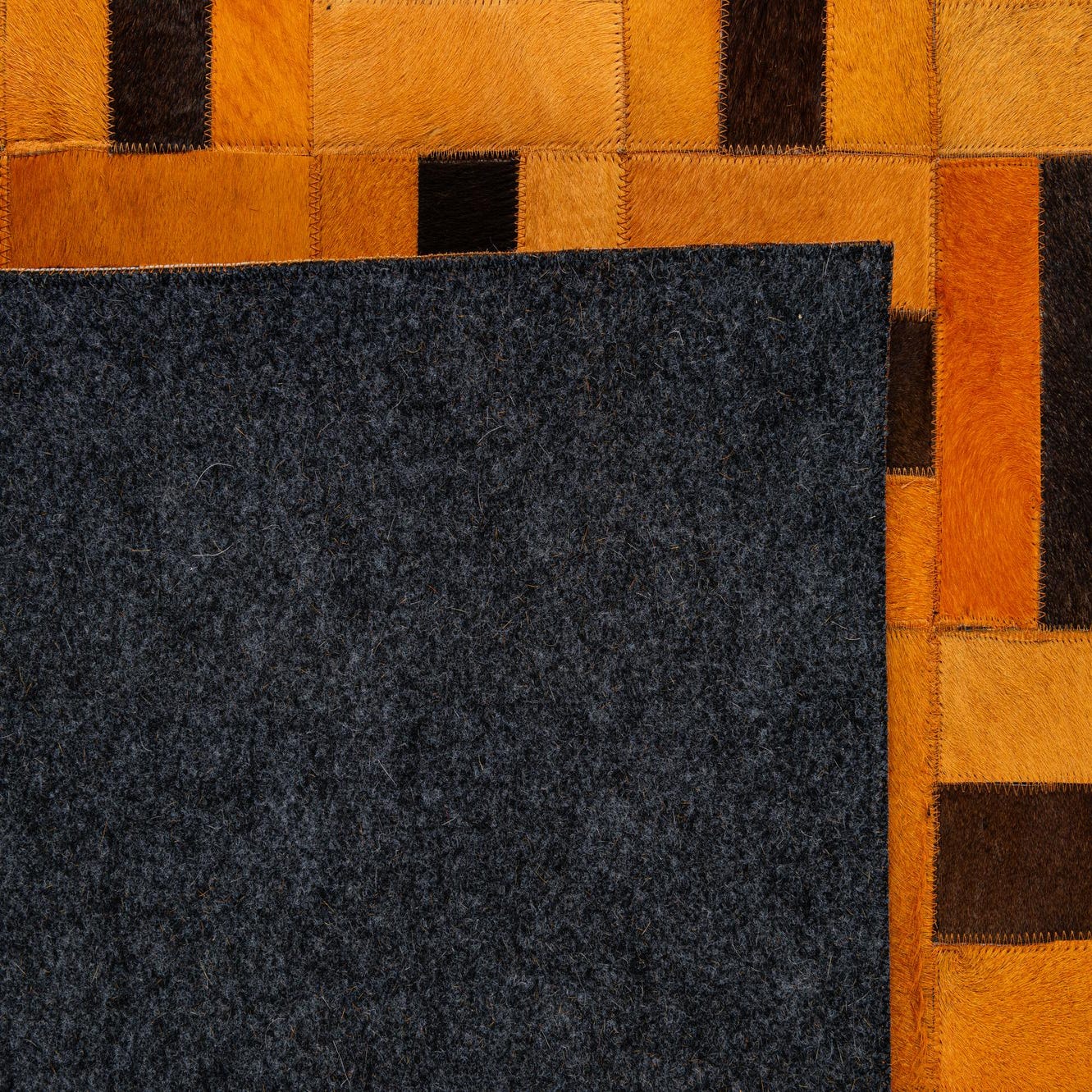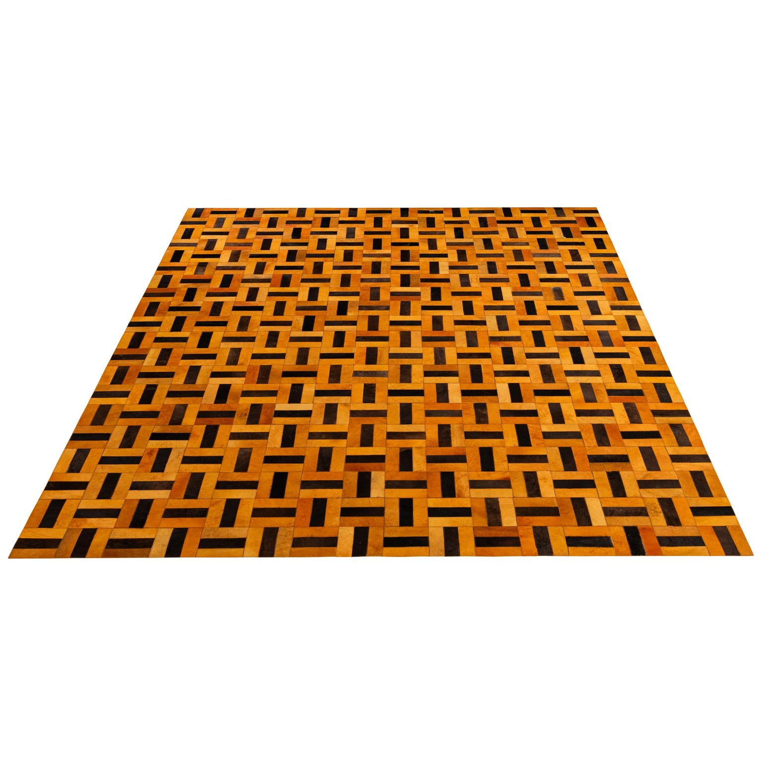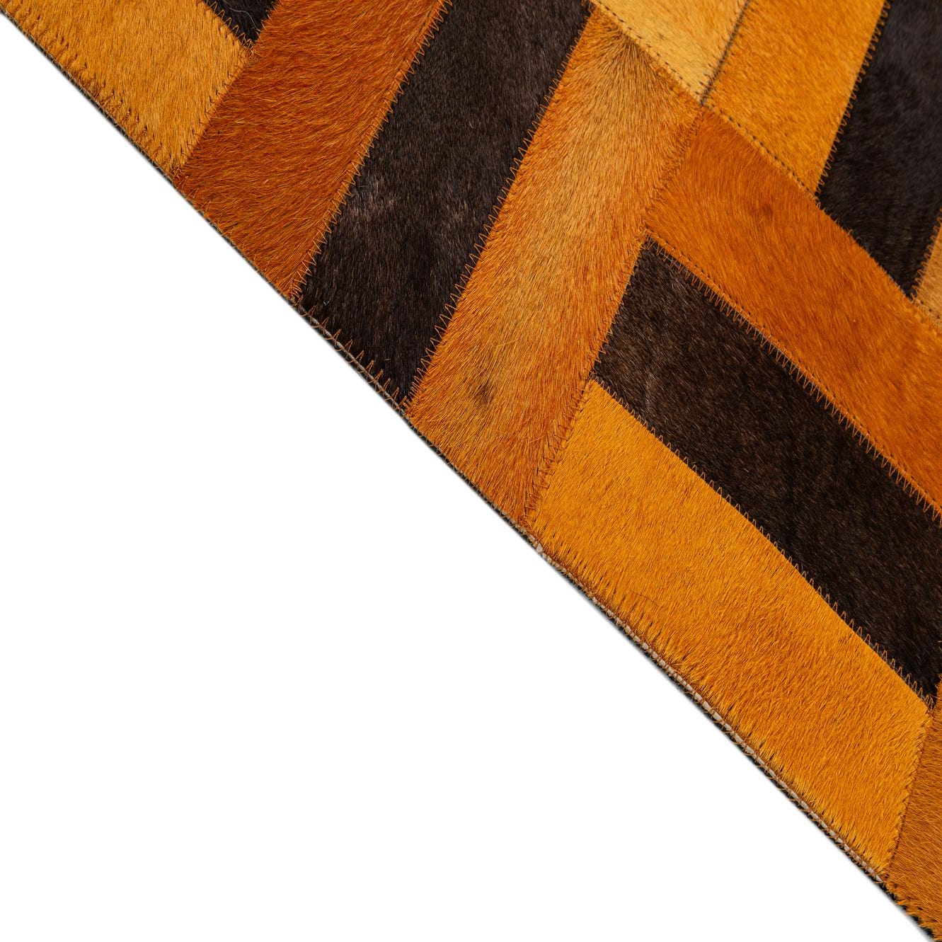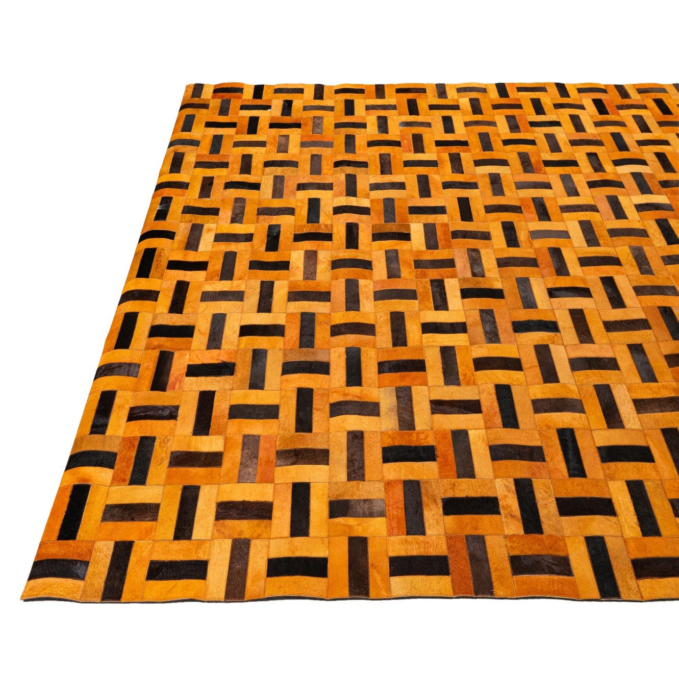 8x10 rectangular Cowhide - Patchwork rug featuring a modern stripe pattern in varying shades of orange and black.