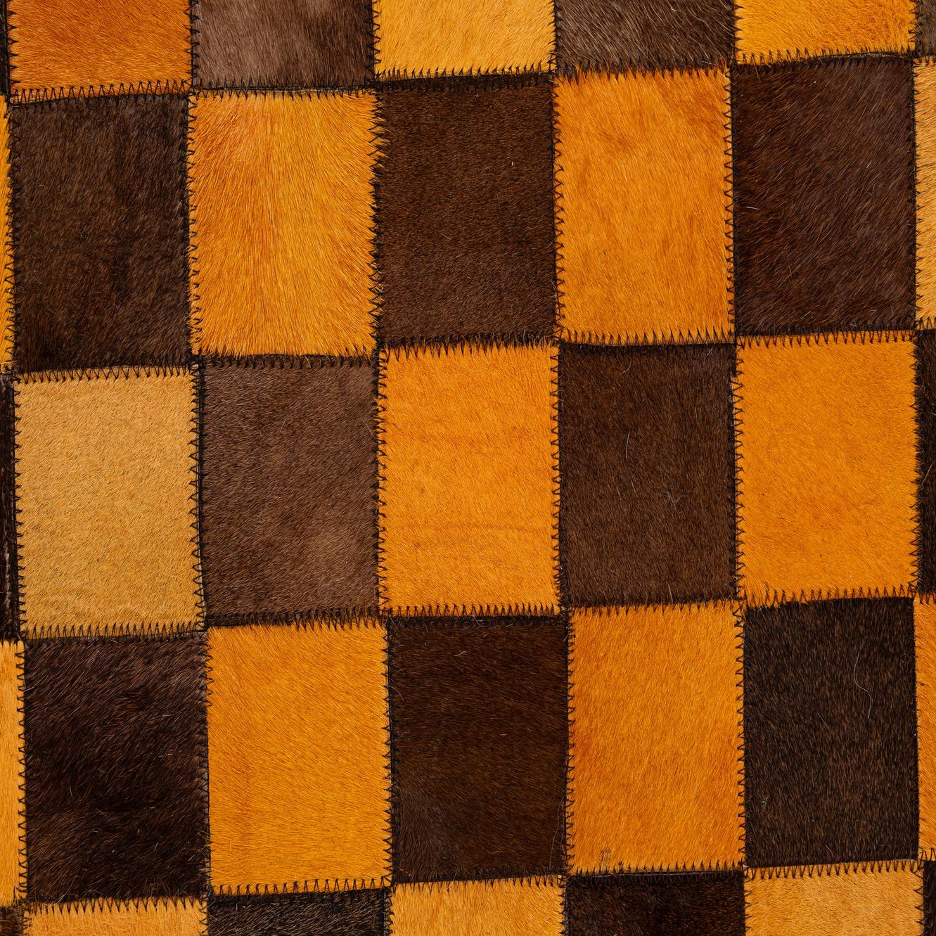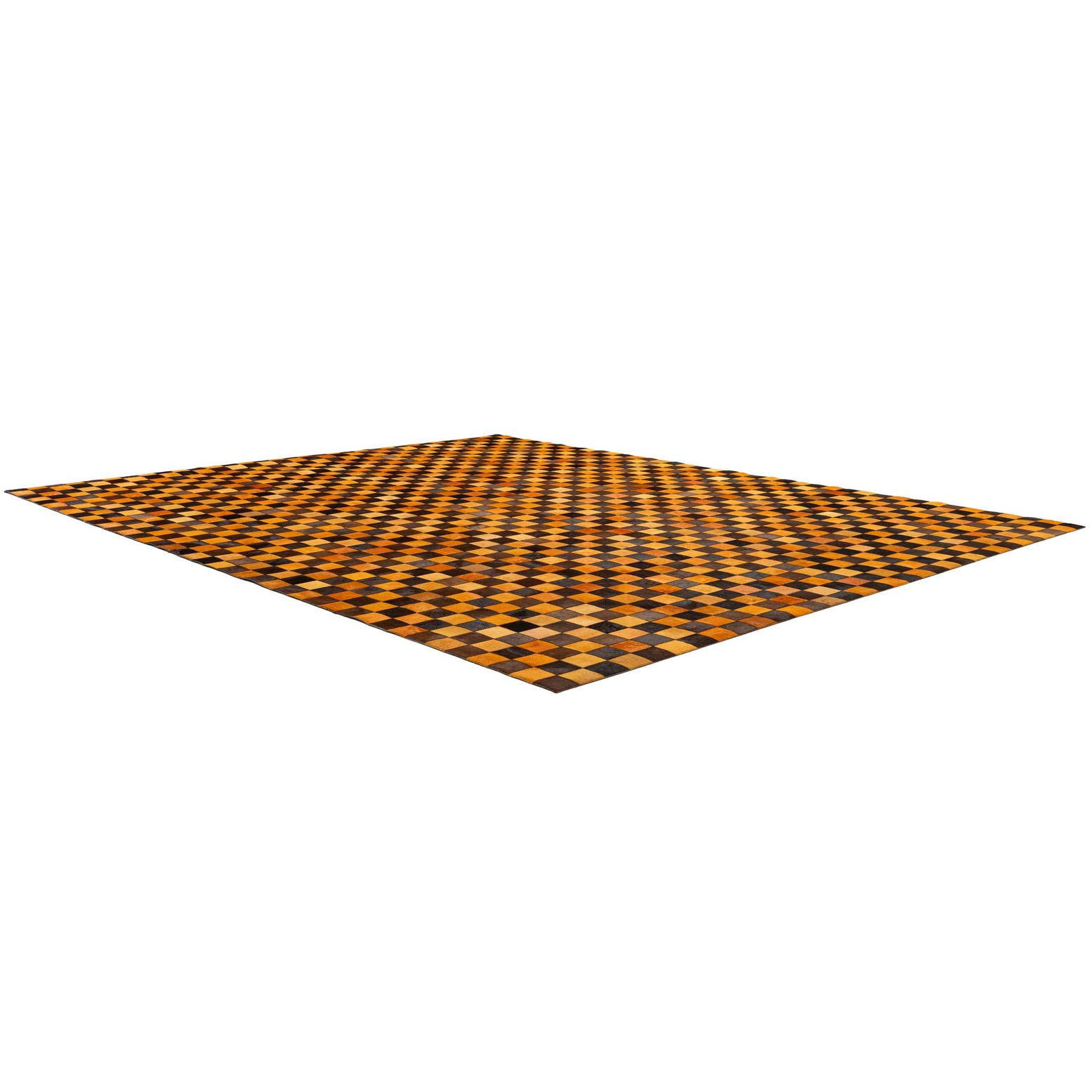 A rectangular 8x10 Cowhide Patchwork rug featuring a modern checkerboard pattern in varying shades of orange and dark brown.