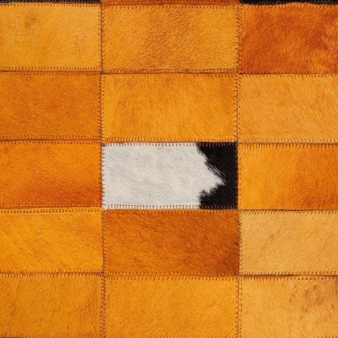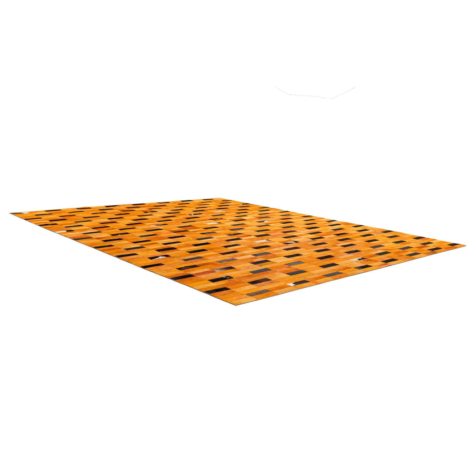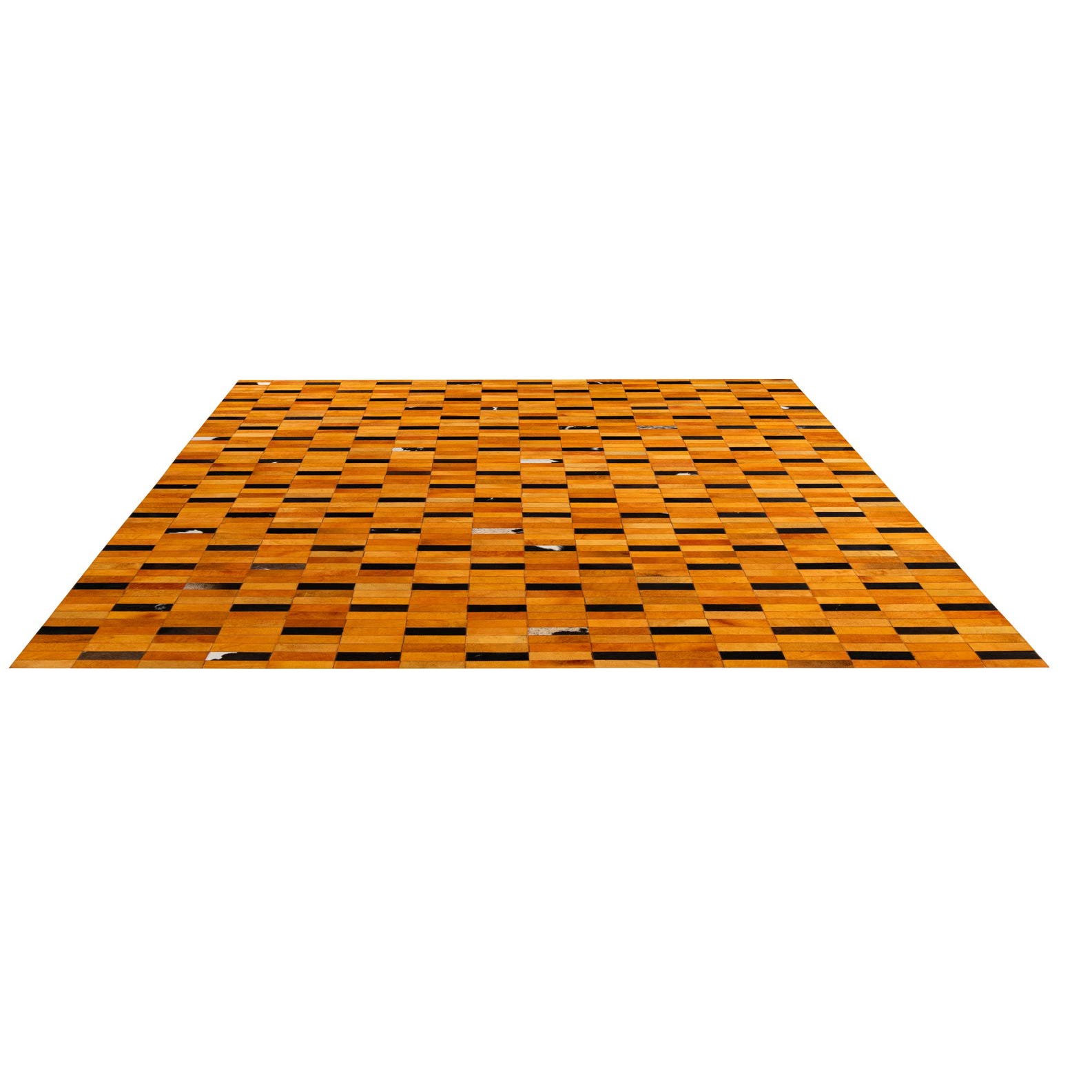 A rectangular 8x10 orange cowhide rug featuring a modern patchwork pattern with alternating black and orange rectangular pieces.