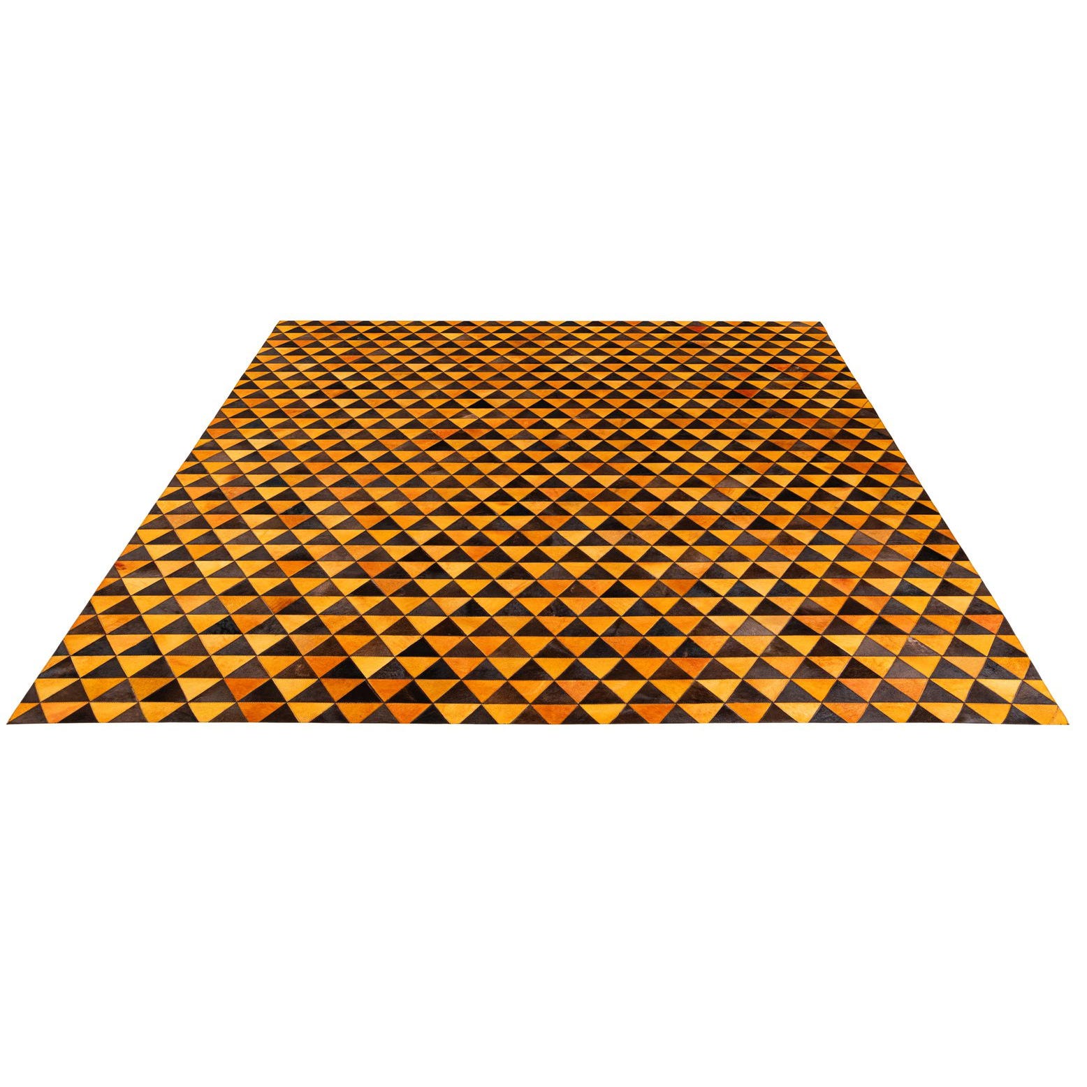 A rectangular 8x10 orange and black modern cowhide rug with a repeating triangular geometric pattern.