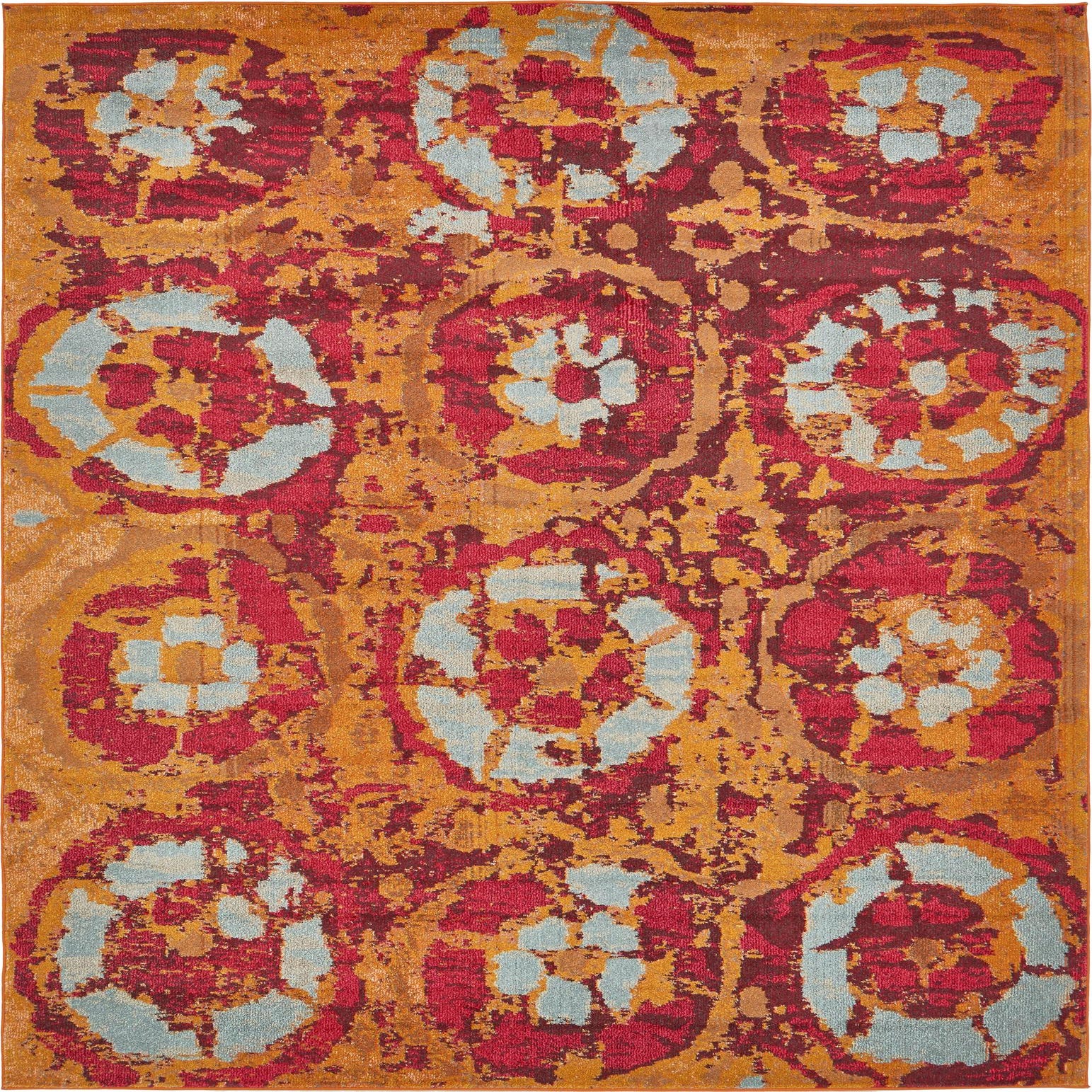 Primary color is Orange. Colors in this rug include: Orange, Beige, Burgundy, Red, Brown, Light Blue.