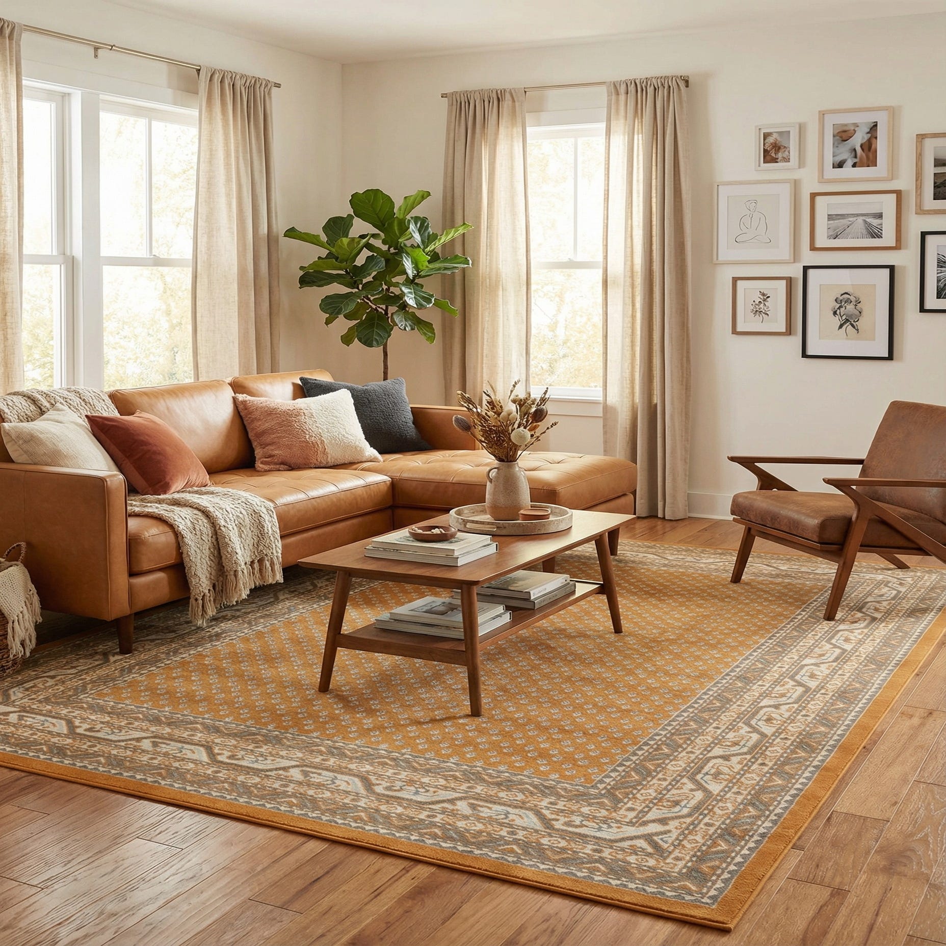 Use this rug to ground a living room seating area or beneath a dining table to introduce warmth and pattern. It pairs naturally with mid-century modern wood tones, contemporary gray upholstery and brass accents, or an eclectic mix of woven textiles and leather. The durable polypropylene construction makes it a practical choice for family rooms, entryways, or any space where you want reliable performance with a comfortable, refined texture.