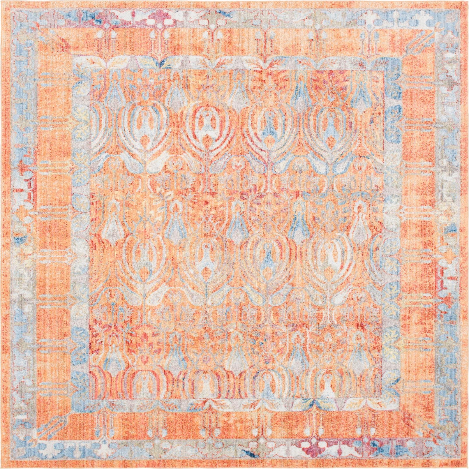 Primary color is Orange. Colors in this rug include: Orange, Beige, Blue, Ivory, Red, Pink.