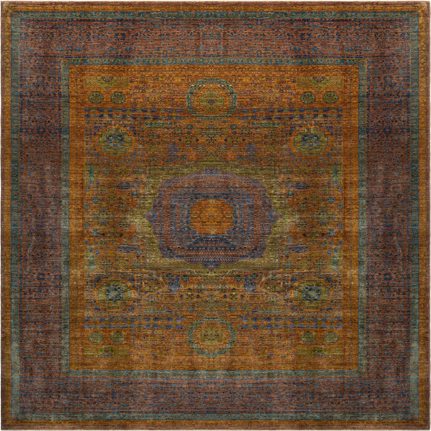 This piece would be an excellent choice for interiors seeking a splash of color and an element of traditional design with a modern twist. Its rich palette would complement spaces with earthy and warm undertones, such as rustic or Mediterranean-themed decor, or act as a striking focal point in minimalist and contemporary settings. Whether it anchors a living room, defines a dining area, or adds a touch of sophistication to a bedroom, this rug would be a versatile and artistic addition to a variety of interior design scenarios.
