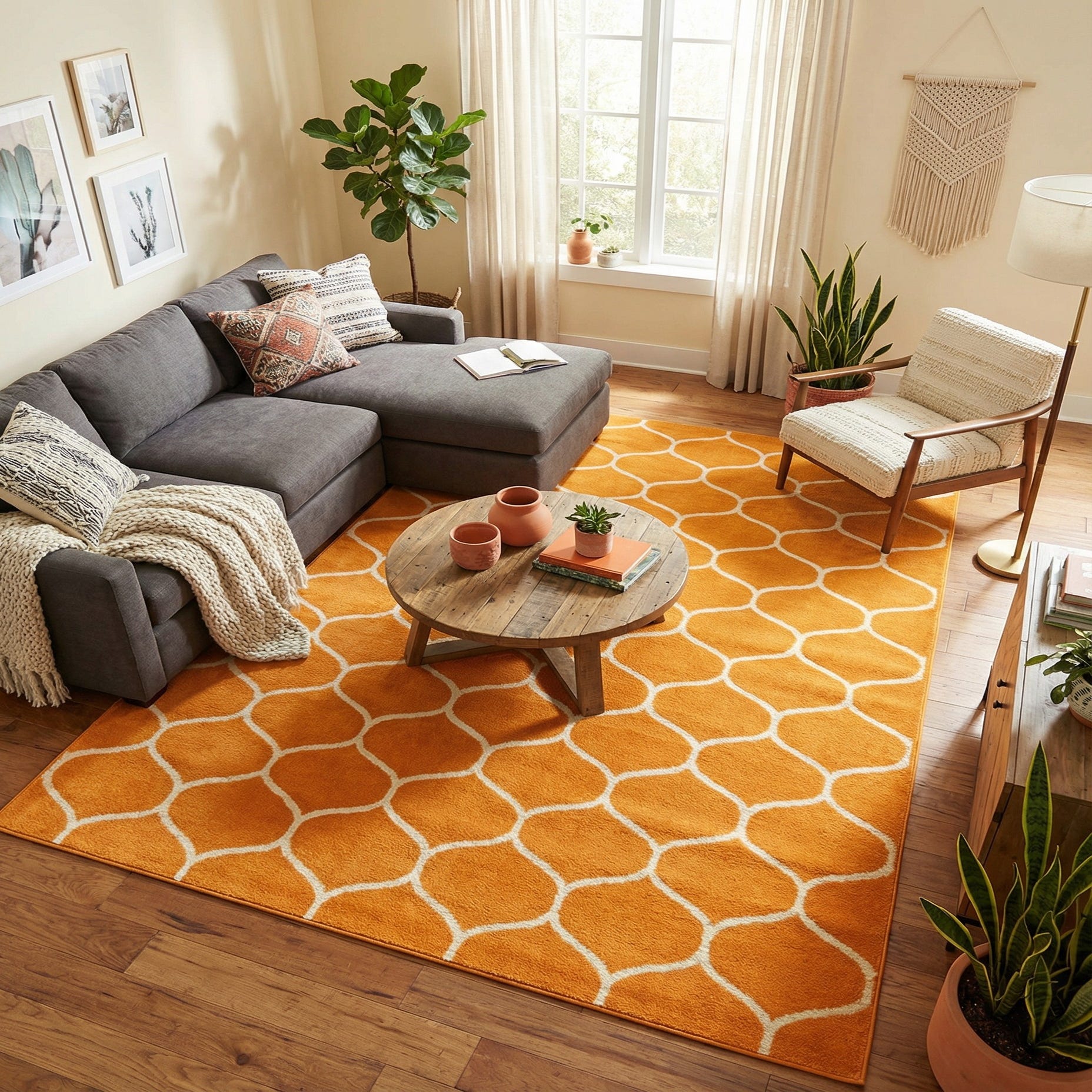 A bright orange field is traced with an ivory lattice of softly rounded ogee shapes, creating a repeating geometric rhythm that feels lively without being busy. Machine-made from 100% polypropylene, the rug has a smooth, even pile with a gentle, slightly cushioned hand and a subtle sheen that highlights the crisp ivory lines against the warm background.
