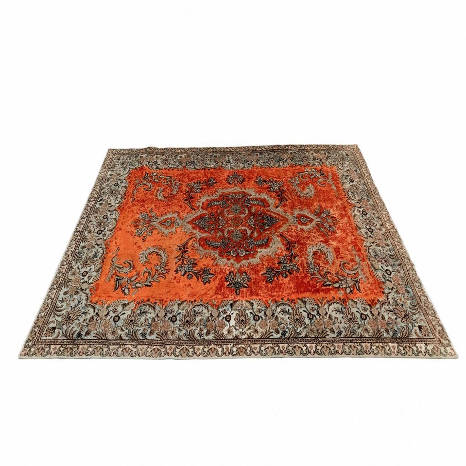 The Vintage Royal Collection offers a handcrafted 8x11 wool rug that boasts a vibrant orange background. The piece is meticulously designed, featuring classical motifs and intricate patterns that draw inspiration from traditional aesthetics. This hand-made rug is constructed from 100% wool, providing both durability and a plush texture underfoot.