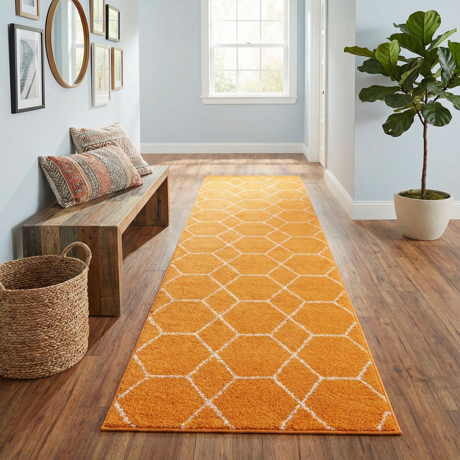 A vivid orange field set against a crisp ivory lattice creates a bold geometric pattern of interlocking hexagons. The honeycomb layout gives the runner a modern, graphic look while the ivory lines add subtle texture and contrast. Machine made from 100% polypropylene, the rug has a soft, dense pile that feels comfortable underfoot and holds its shape along a narrow traffic path.