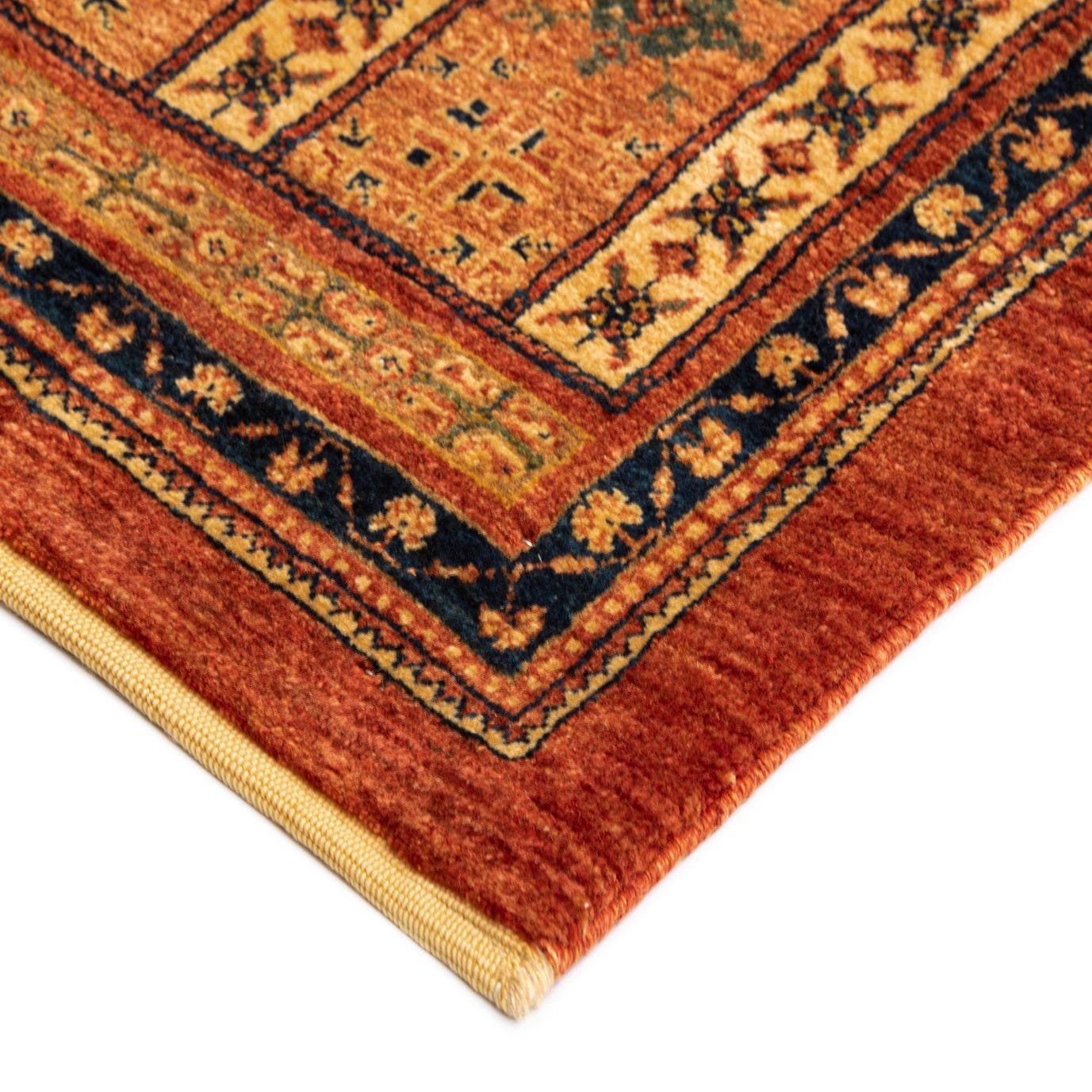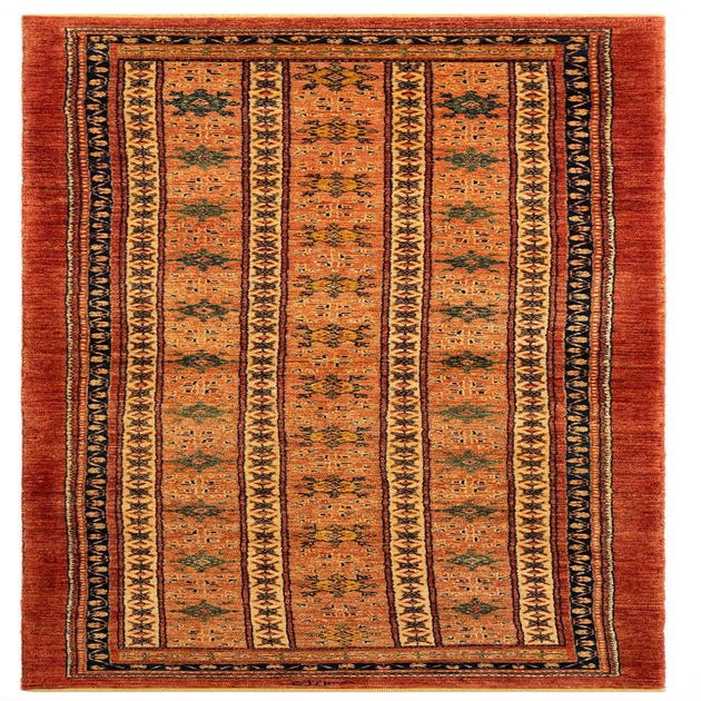 Primary color is Orange. Colors in this rug include: Orange, Orange, Red, Green.