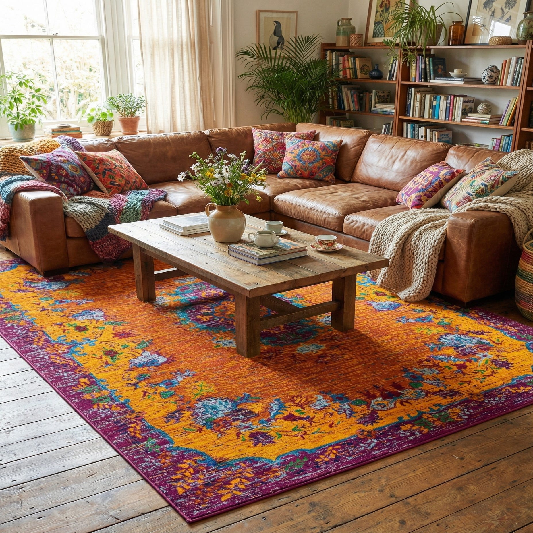 The color story and pattern work well in a living room to anchor a seating group or beneath a dining table to introduce warmth and pattern to the floor. It pairs naturally with warm wood tones and neutral upholstery, and also complements eclectic or bohemian schemes with mixed textiles and bold accessories. Use it in a home office or entry to bring a confident burst of color and a tactile foundation to the space.