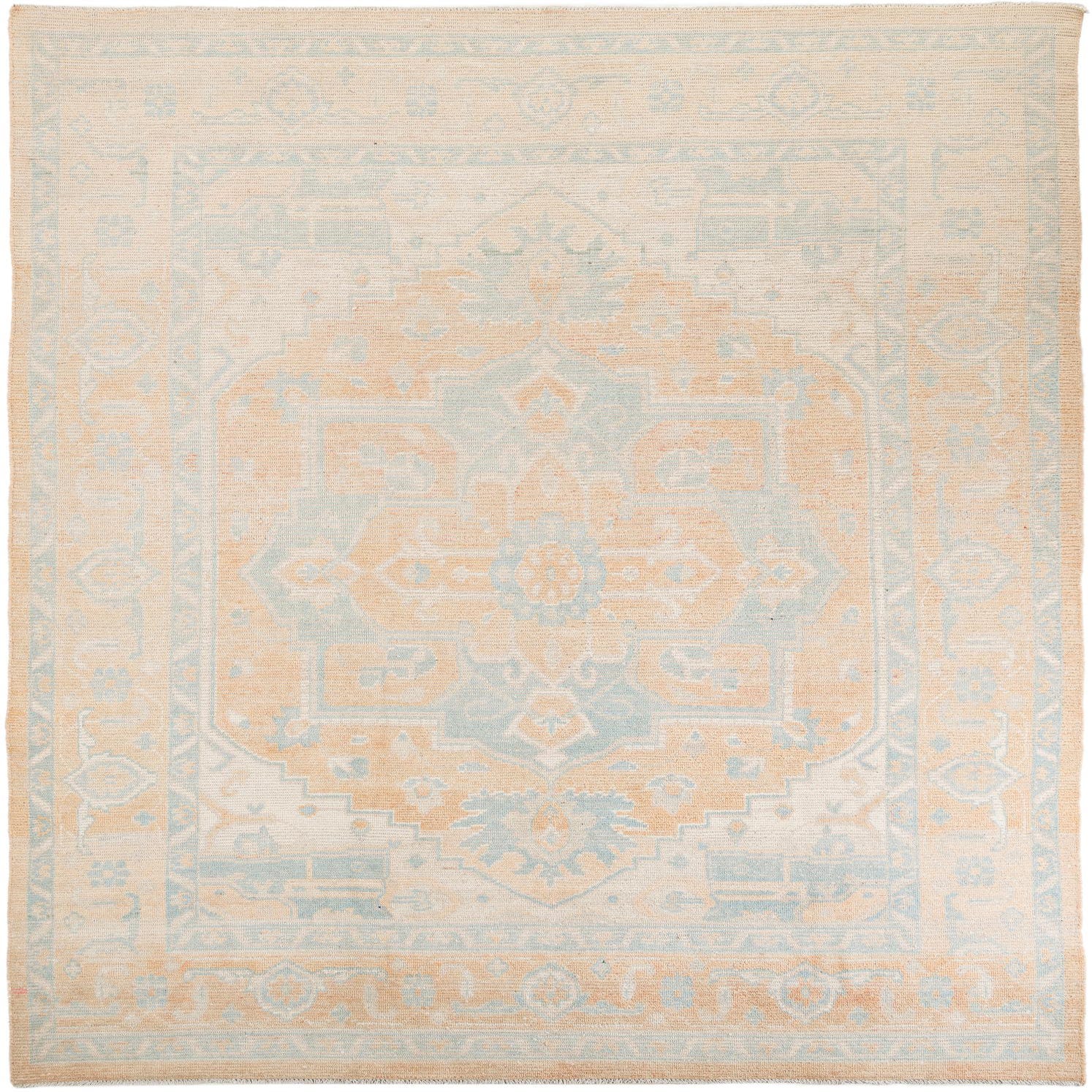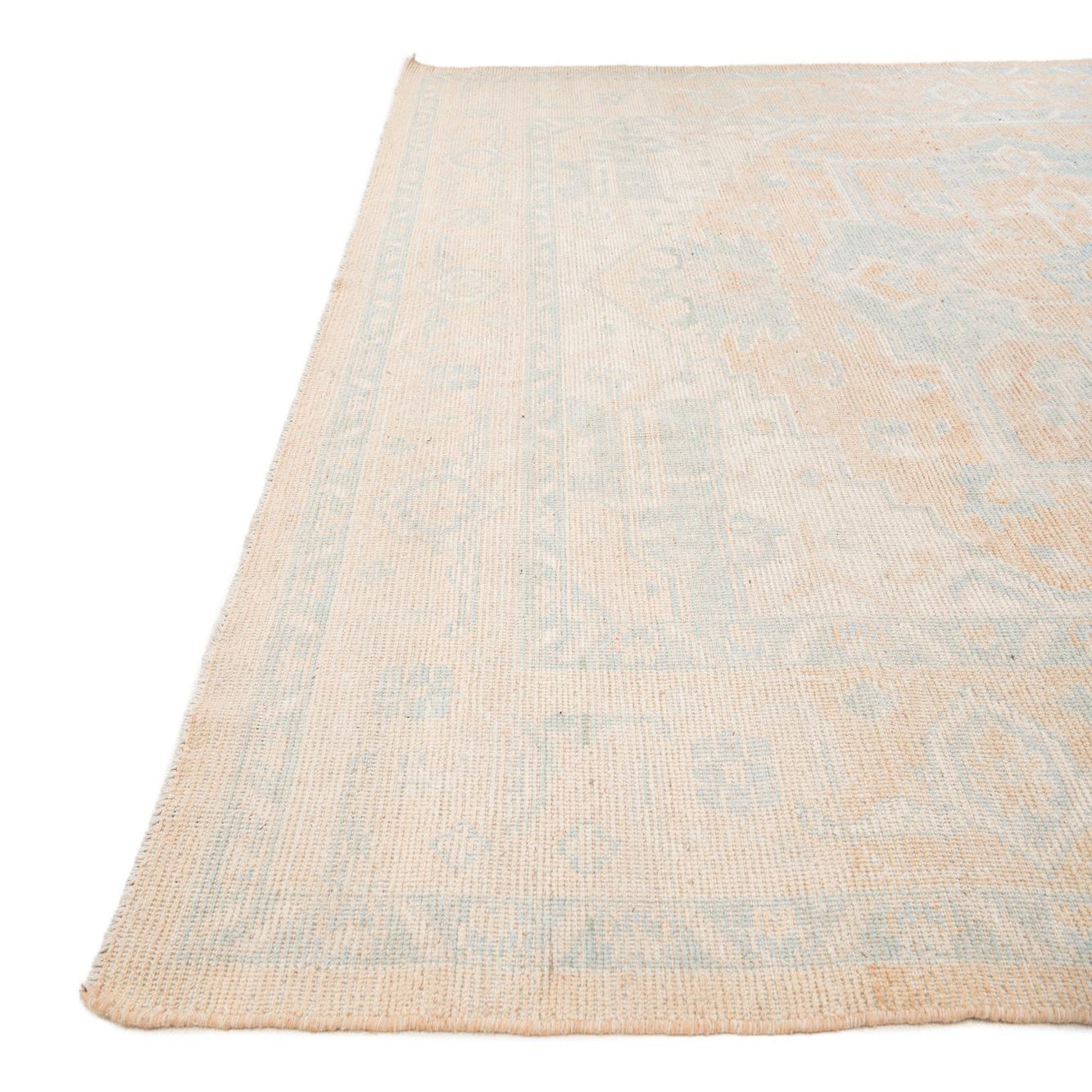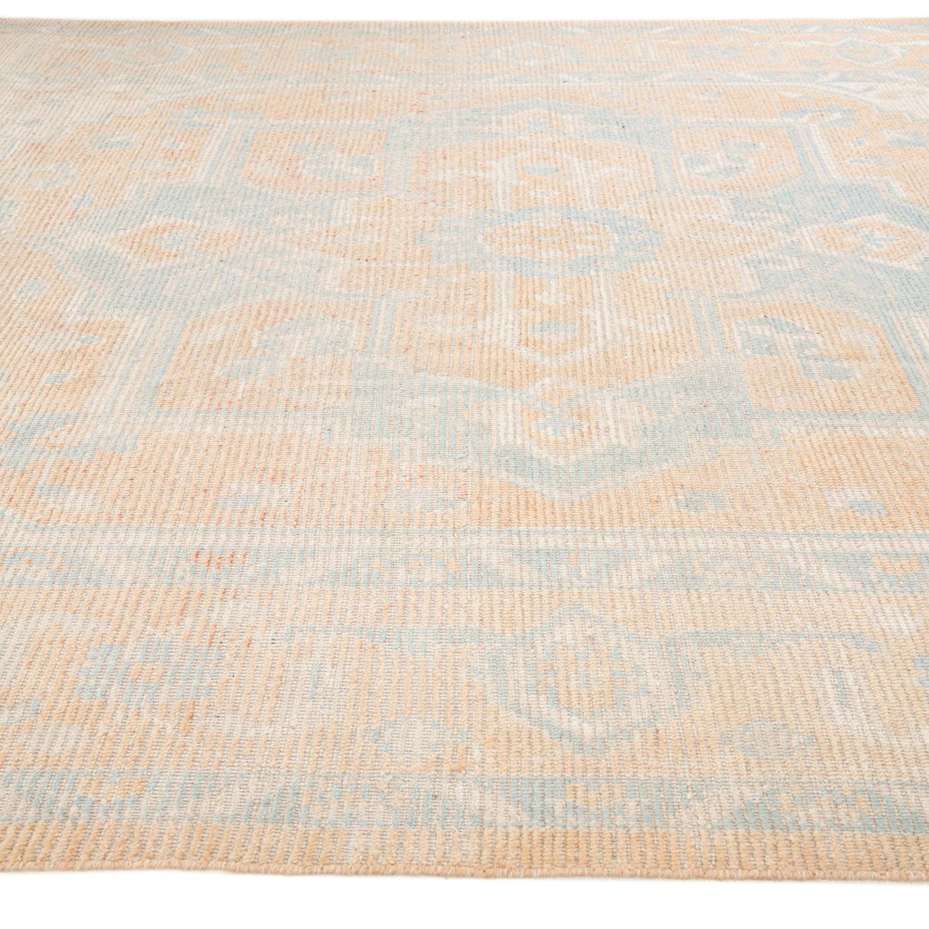A 9x12 rectangular Oushak rug featuring a faded orange and light blue medallion pattern on a cream background.
