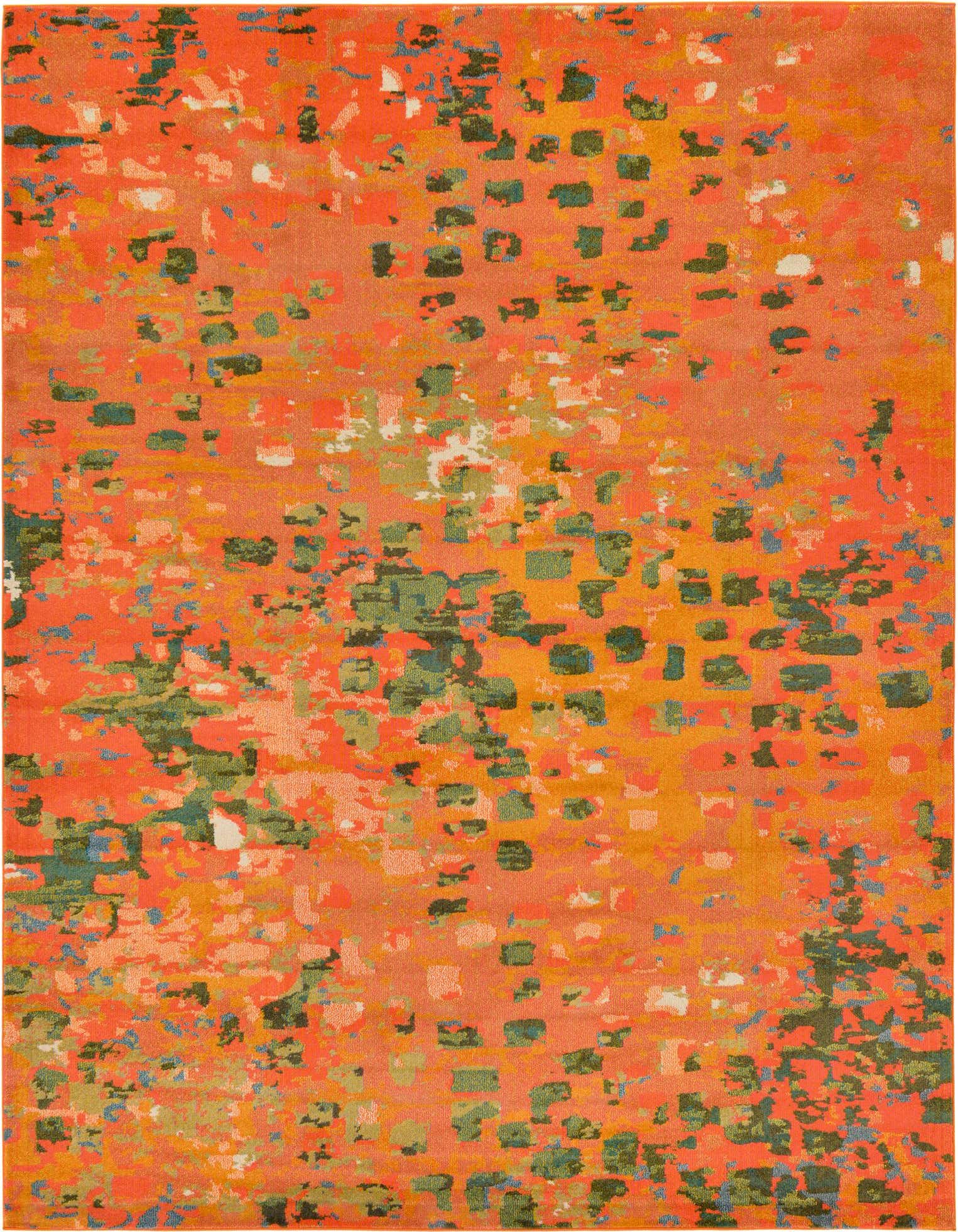 Primary color is Orange. Colors in this rug include: Orange, Hunter Green, Ivory, Light Green, Yellow, Gold.