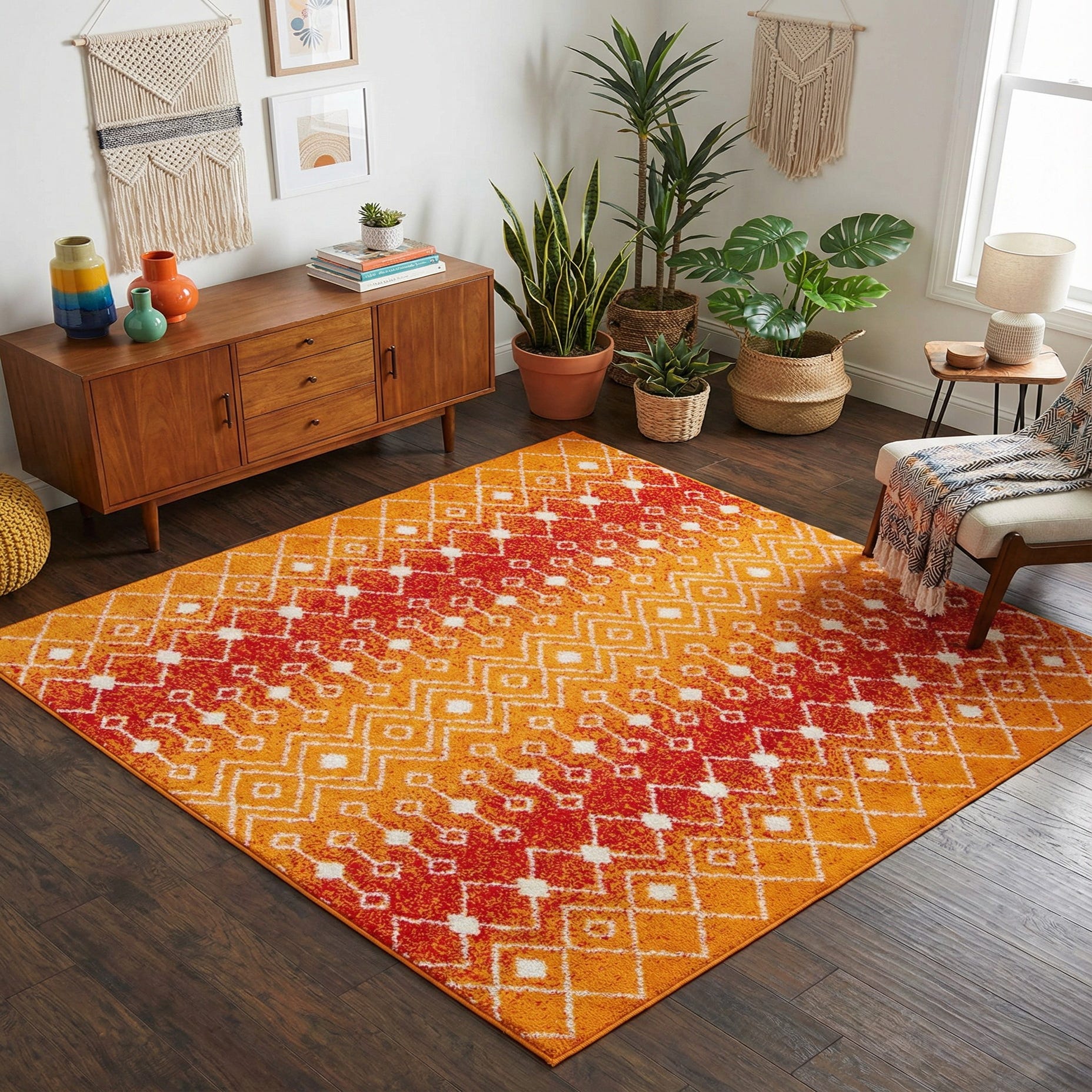 This rug brings energy to a modern living room or can anchor a sunny entry or breakfast nook; it pairs naturally with light or natural wood tones, rattan and wicker accents, and neutral upholstery to balance the bold color. Use it to add warmth and pattern to a mid-century modern scheme, brighten a casual family room, or layer beneath a small dining table to introduce color without overwhelming a space.