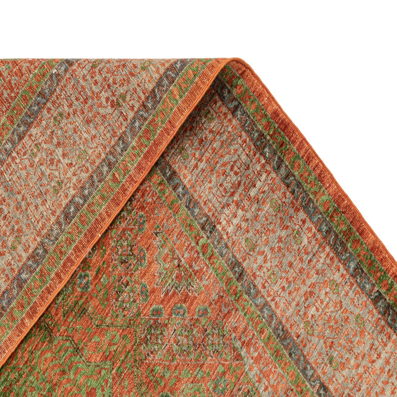 A rectangular handmade Persian wool rug featuring a distressed orange and green floral pattern with a detailed border.