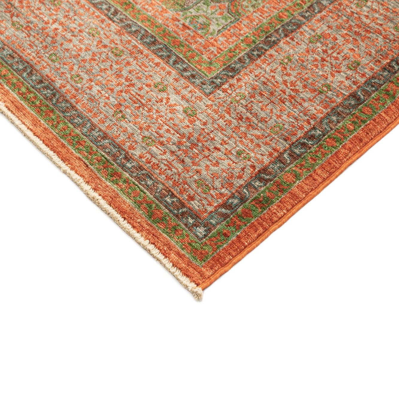 Handmade and hand-knotted in wool, this rectangular rug presents a classic medallion layout set against a warm orange field. Layers of narrow borders frame the central design, while an array of floral and geometric motifs fill the field with an intricate, tapestry-like rhythm. Hints of green and muted neutrals are woven into the pattern, offering depth and subtle contrast against the orange background. The surface has a soft, tactile quality from the dense wool pile, with slight tonal variations that reflect its handcrafted construction.