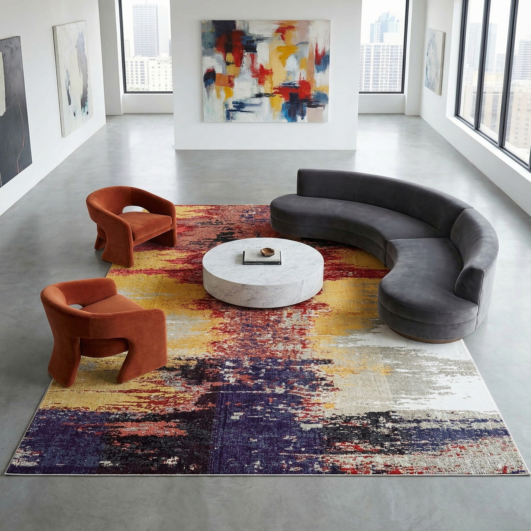 A bold, abstract composition on an orange ground, this rug uses painterly, distressed strokes to build visual depth across the surface. A central vertical band of burgundy and red is punctuated by navy blue and gray accents, while beige fields and lighter gray washes soften the edges. The pattern reads like a modern art canvas with an energetic, layered feel — color and texture work together to create movement without a strict repeat.