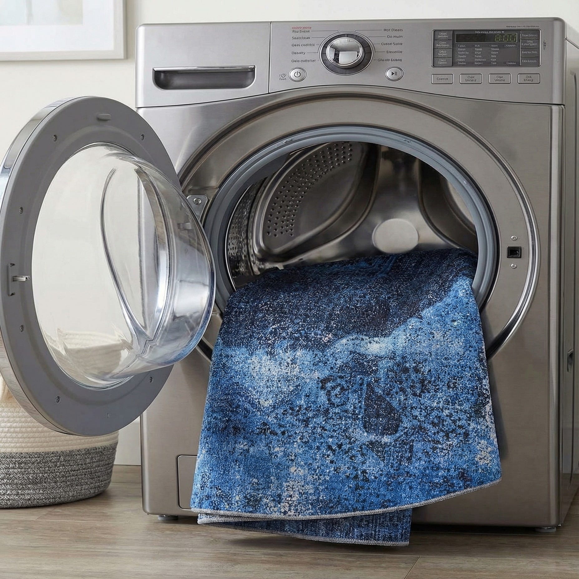 Machine-made from polyester and chenille, the surface offers a pleasant contrast in hand: chenille areas feel plush and velvety, while polyester sections provide a smoother, denser finish that keeps the pile low and even. This round piece works well beneath a circular dining table, as a cozy anchor in a conversation area or reading nook, or as a bold color statement in an entryway. Pair it with warm woods and neutral upholstery to let the blue tones pop, or combine with brass accents and soft textiles for a layered, modern-traditional mix.