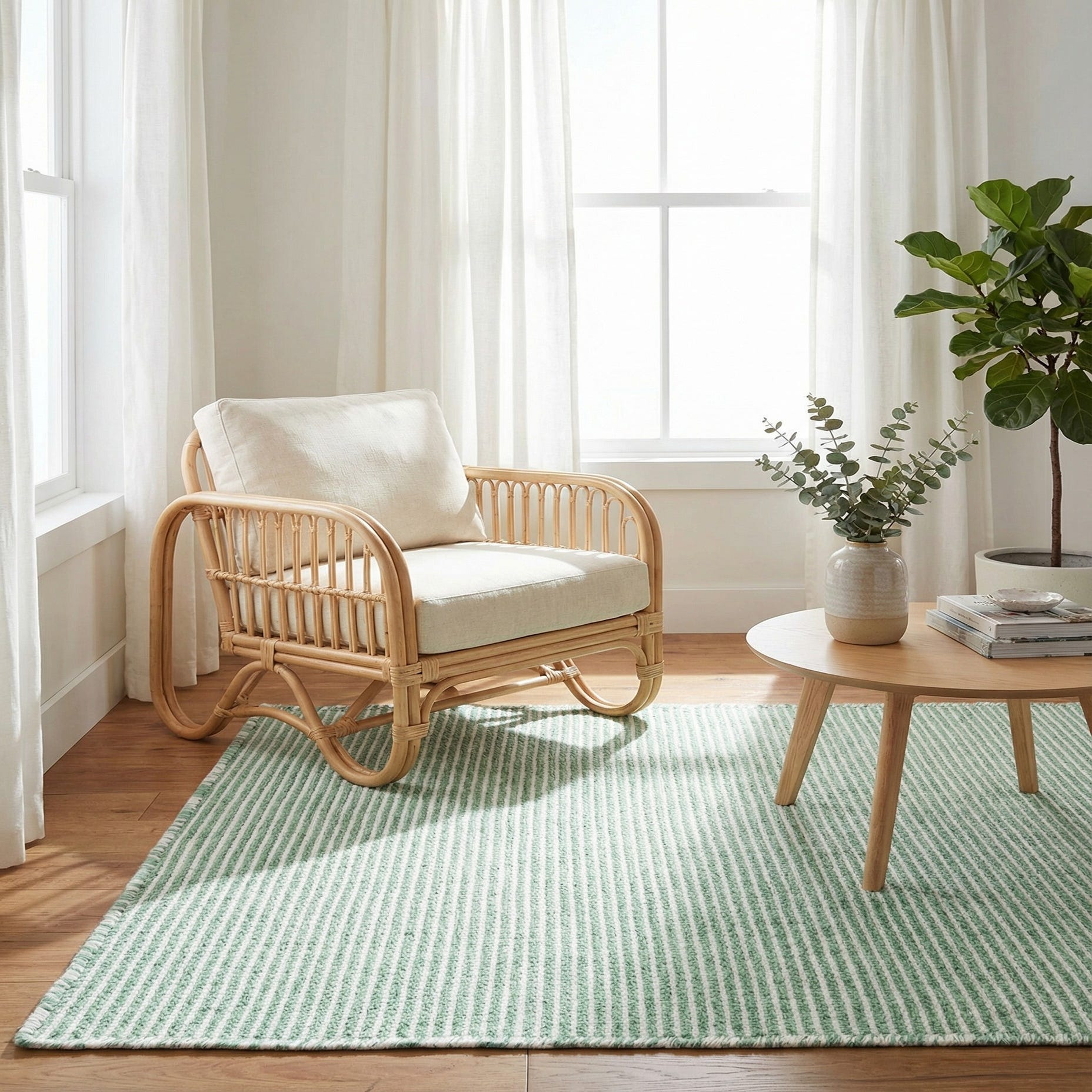 A 2x3 rectangular Jill Zarin Palm Springs Outdoor rug featuring a modern striped pattern in palm green and white, with a textured flatweave.