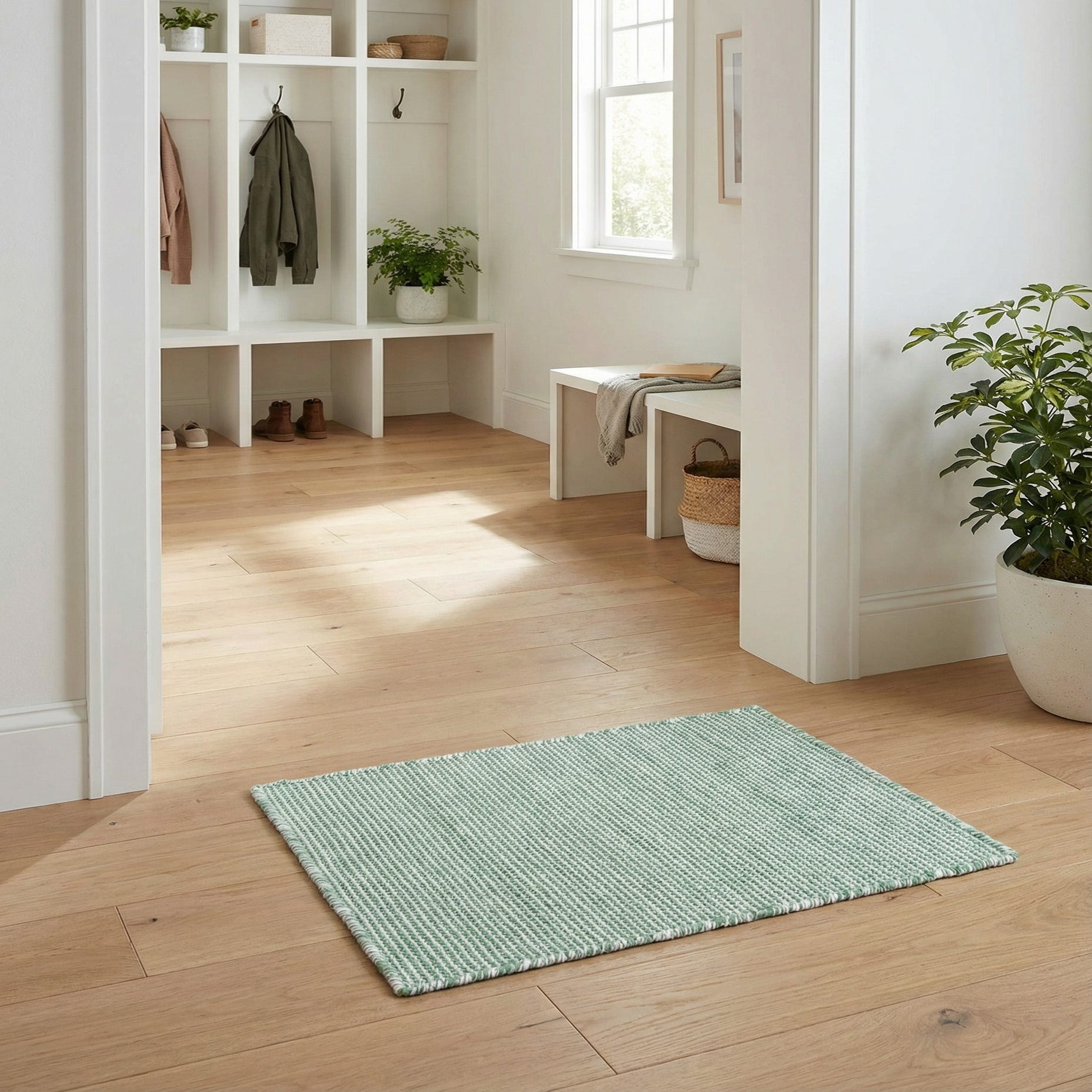 Primary color is Palm Green. Colors in this rug include: Palm Green, Ivory.