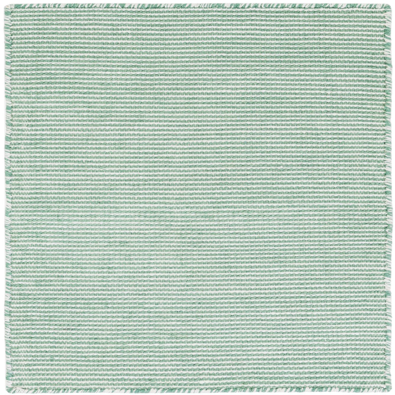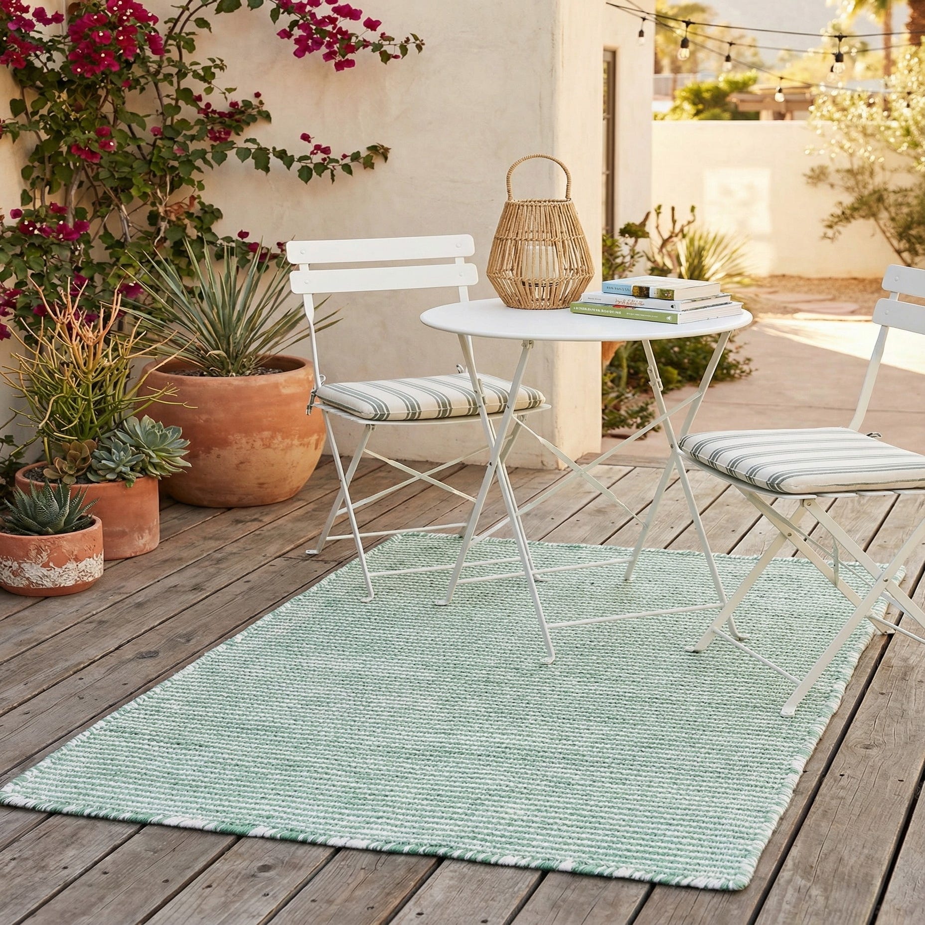 A 2x3 rectangular Jill Zarin Palm Springs Outdoor rug featuring a modern striped pattern in palm green and white, with a textured flatweave.