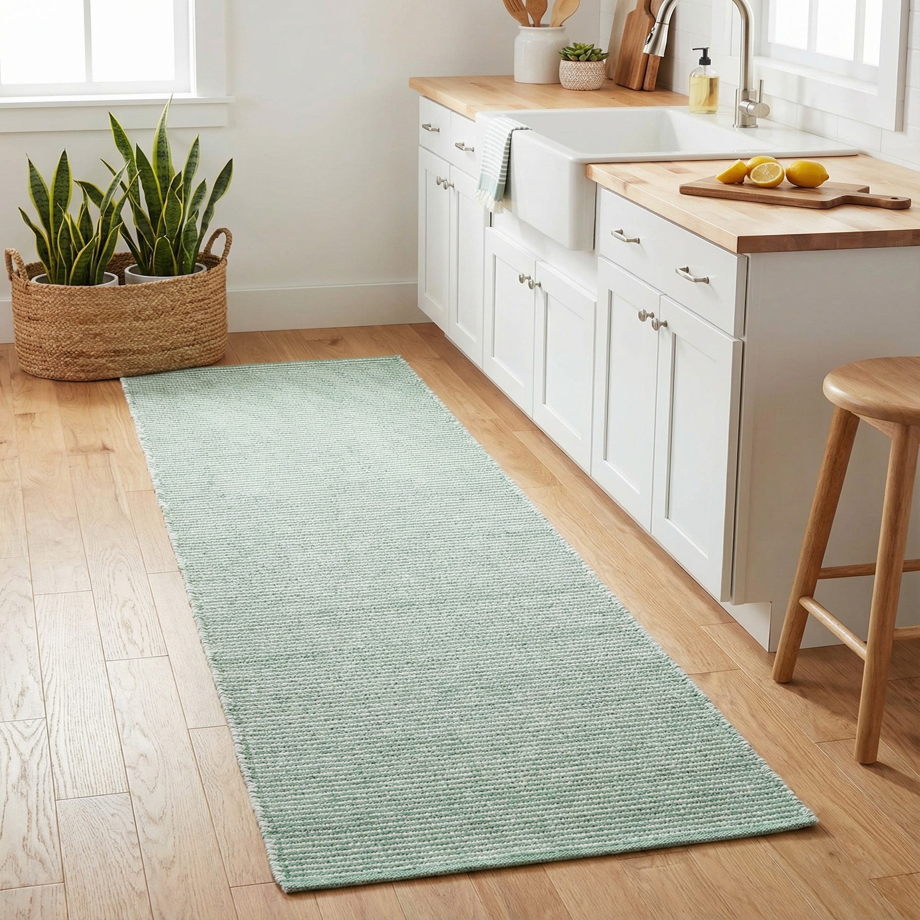 A 6 ft runner rug in a solid palm green color with a subtle textured flatweave pattern, ideal for a hallway or patio.