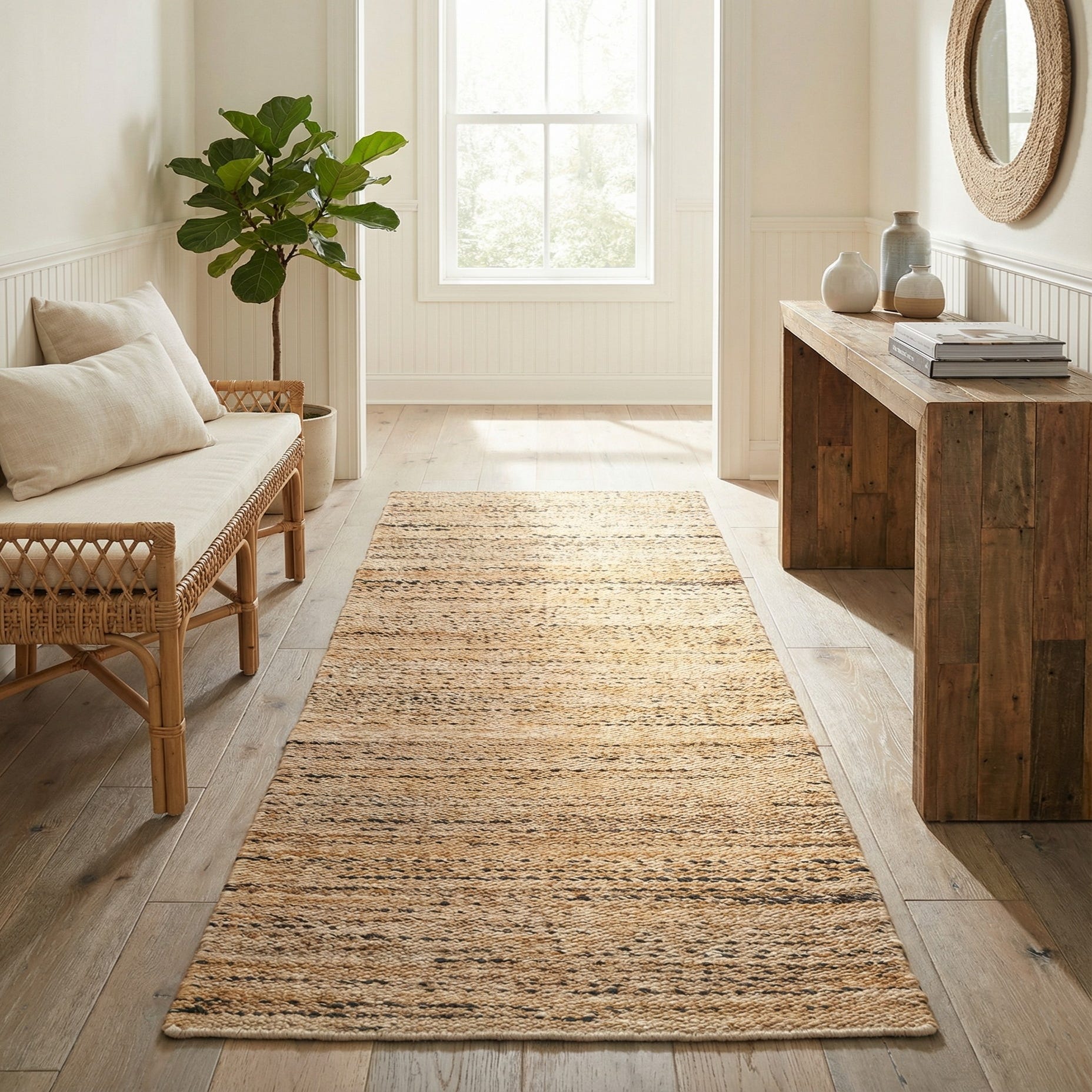 Place this runner in a hallway, entry or kitchen galley to introduce grounding texture without dominating the room. It complements coastal and modern farmhouse schemes as well as boho or transitional interiors, pairing naturally with rattan, reclaimed wood, navy or olive accents and matte metal hardware. Use it under a narrow console or alongside a bed to add warmth and tactile interest to hardwood or tile floors.