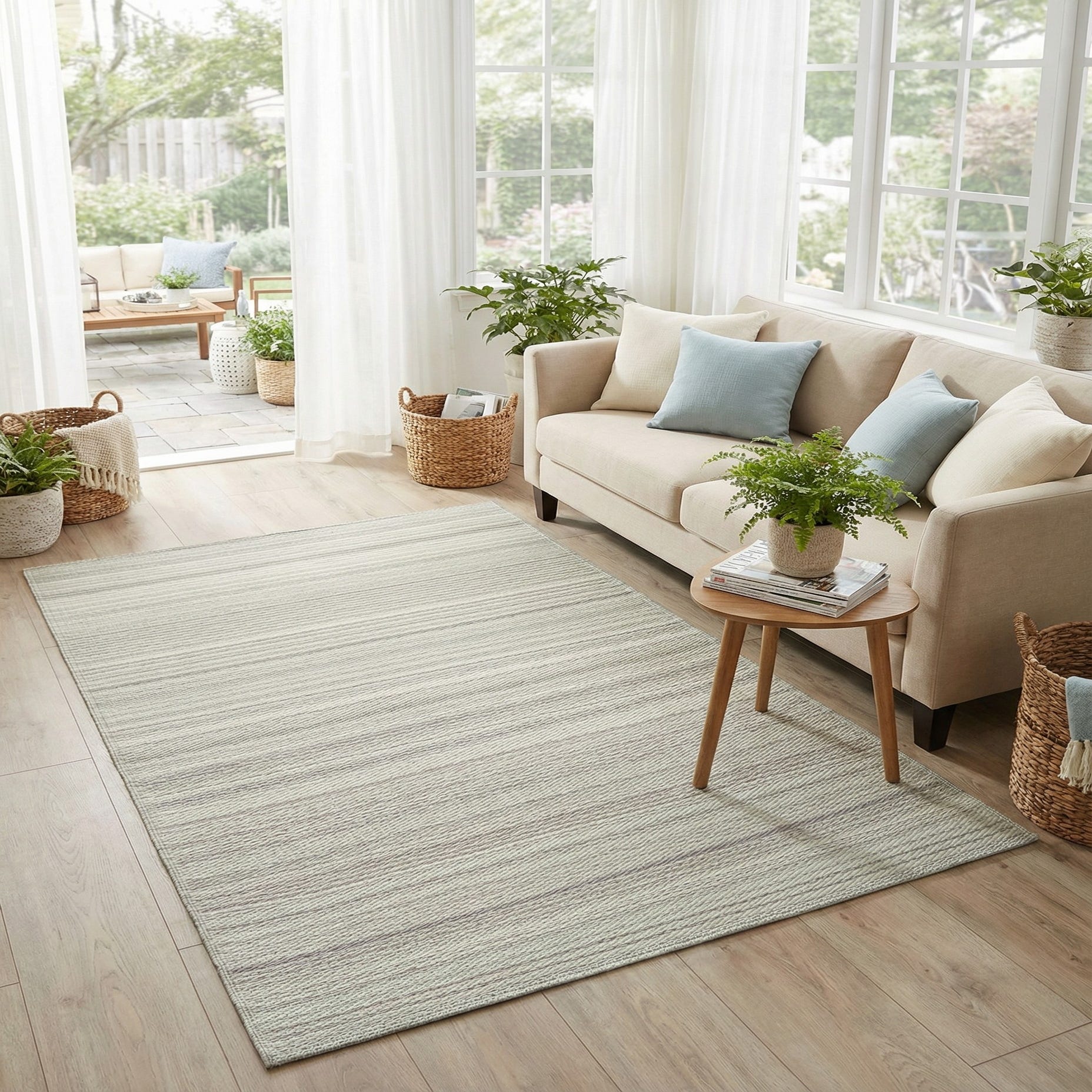 The gentle palette and restrained pattern work well in modern coastal, Scandinavian, or transitional settings. Use it to ground a covered patio or sunroom, pair it with a light-wood dining set for a casual alfresco dining area, or place it under a low-profile sofa to bring calm, airy balance to a minimalist living room. The durable polypropylene construction makes it a practical choice for spaces where you want clean lines and easygoing style.