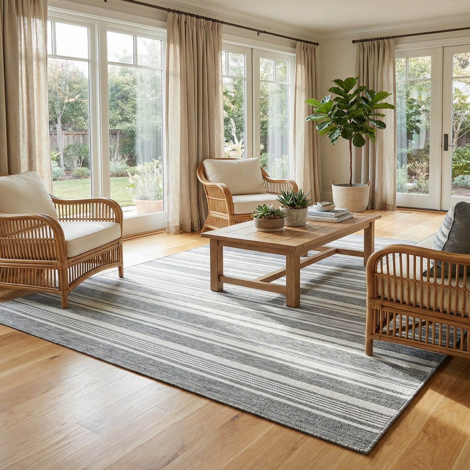 Works well on a covered patio or sunroom as a neutral foundation, and pairs easily with wicker or painted-wood furniture for a relaxed, coastal feel. In interiors, it complements minimalist or modern farmhouse schemes—use it to ground a seating area, define a dining zone, or layer under a simple coffee table to introduce quiet pattern without heavy contrast.