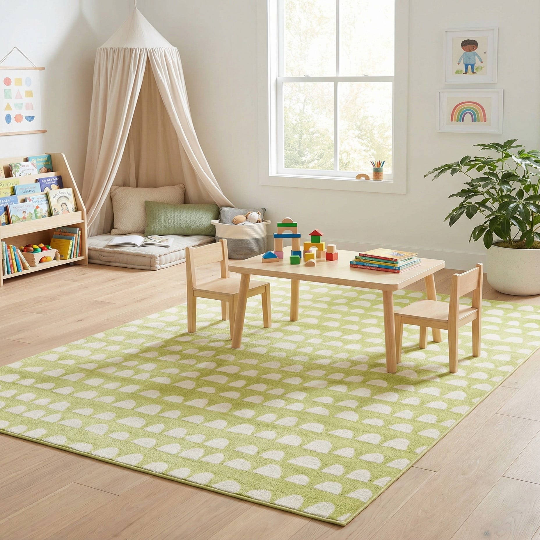 Pastel green provides a fresh, cheerful field for a repeating pattern of ivory half-moon arches arranged in neat horizontal rows. The simple, modern motif has a playful, rhythmic quality that feels youthful without being fussy, and the clean contrast between the pastel green background and ivory shapes keeps the look crisp. Machine-made from 100% polypropylene, the rug has a low-pile, soft surface that feels comfortable underfoot while maintaining a tidy, even texture across the face.